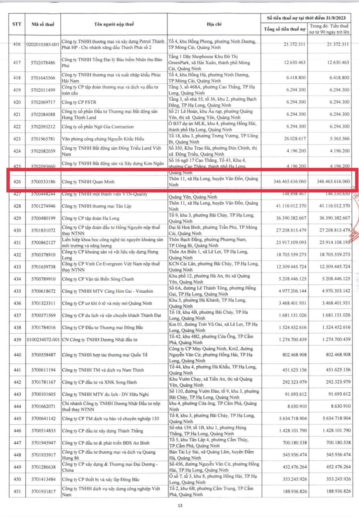 Nằm trong “top” các doanh nghiệp có số tiền nợ thuế, phí nhiều nhất, đứng đầu là Công ty TNHH Quan Minh (huyện Vân Đồn) nợ hơn 346,4 tỷ đồng. Tiếp theo là Công ty CP Đầu tư phát triển Syrena Việt Nam (TP Hạ Long) nợ 187,9 tỷ đồng; Công ty TNHH Vận tải Việt Thuận (TP Uông Bí) nợ hơn 85,2 tỷ đồng; Công ty CP Thống Nhất 508 (TP Hạ Long) nợ hơn 82,2 tỷ đồng;…