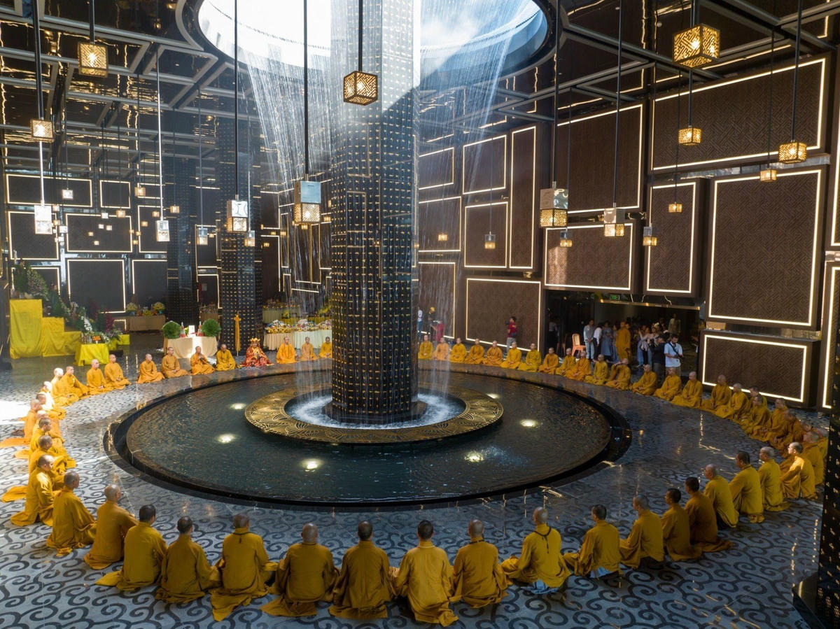 Các tăng ni, Phật tử, du khách đã cùng thực hành hạnh nguyện tri ân báo hiếu đến các bậc sinh thành với nghi thức diễu hành bên trụ kinh Bát Nhã, giữa không gian kỳ ảo, lung linh.