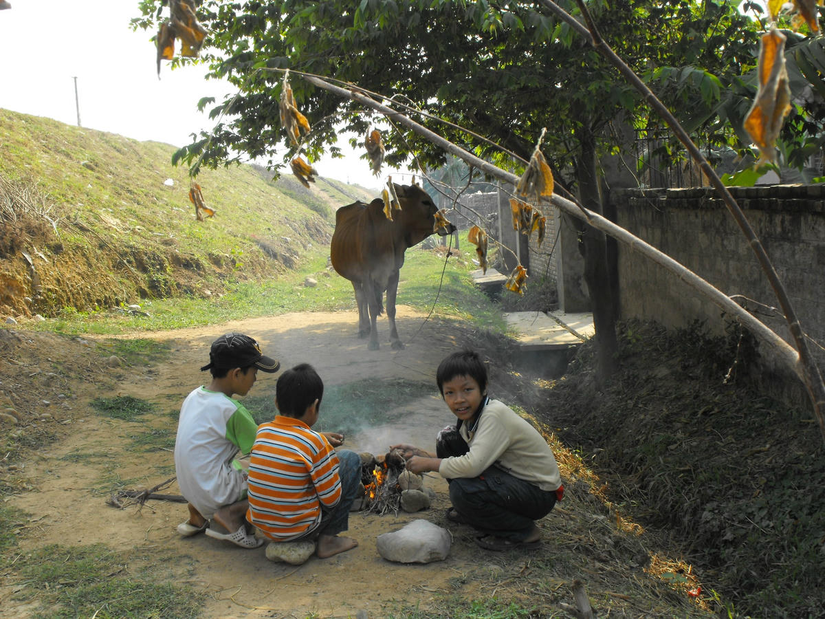 Nhưng mùa đông và đầu xuân thì không được như vậy, rất cực. Đầu đông thì tiết trời hanh khô, giữa đông thì rét căm căm, sương muối giăng đầy, đầu xuân thì không chỉ rét mà còn có mưa phùn, ẩm ướt. Giữa tiết trời ấy cỏ cây già cỗi, héo úa, trâu thường bị đói. Mục đồng chúng tôi cũng không còn có thể tập trung, tụ bạ để chơi đùa mà co ro trong manh áo tơi bên con trâu trên đồng làng hun hút gió. Thường thì “cái khó ló cái khôn”, để chống rét khi ấy đám mục đồng nghĩ ra cách móc đất thịt lên, nặn thành những chiếc bếp lò mi-ni, nhặt quả thông khô cho vào, châm lửa, để ngược chiều gió. Khói, lửa bốc lên, mùi quả thông cháy tỏa ra xung quanh rất thơm, người ấm hẳn!