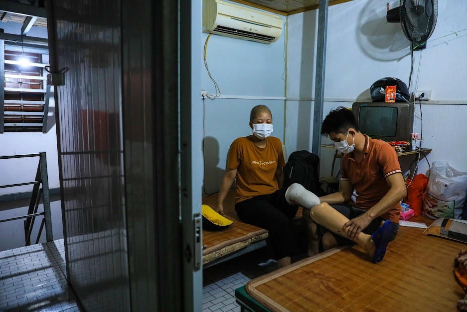 Trong căn phòng trọ chật hẹp chưa đầy 10 m2, anh Bùi Thanh Hòa gạt đi nước mắt để giúp con gái tháo chiếc chân giả chuẩn bị tắm rửa, vệ sinh cá nhân.