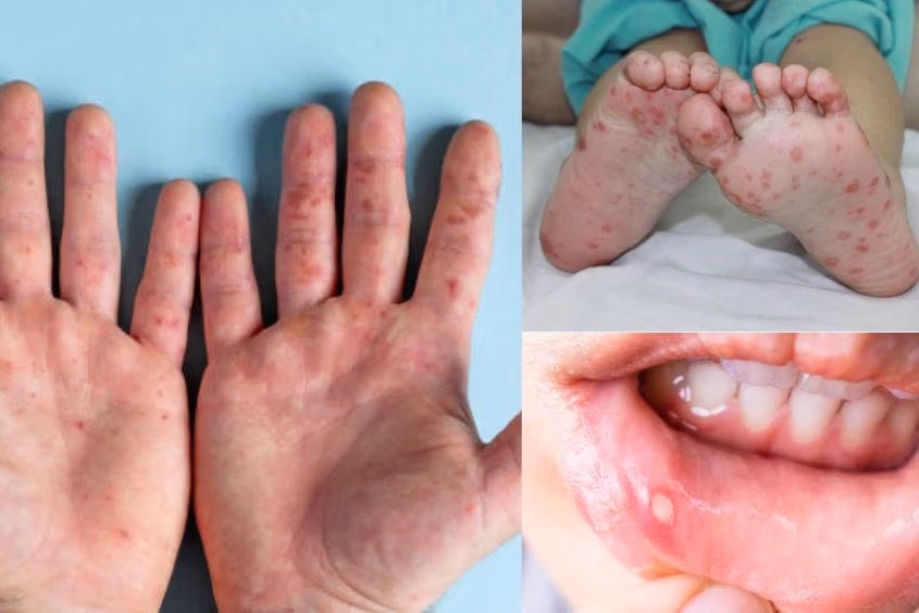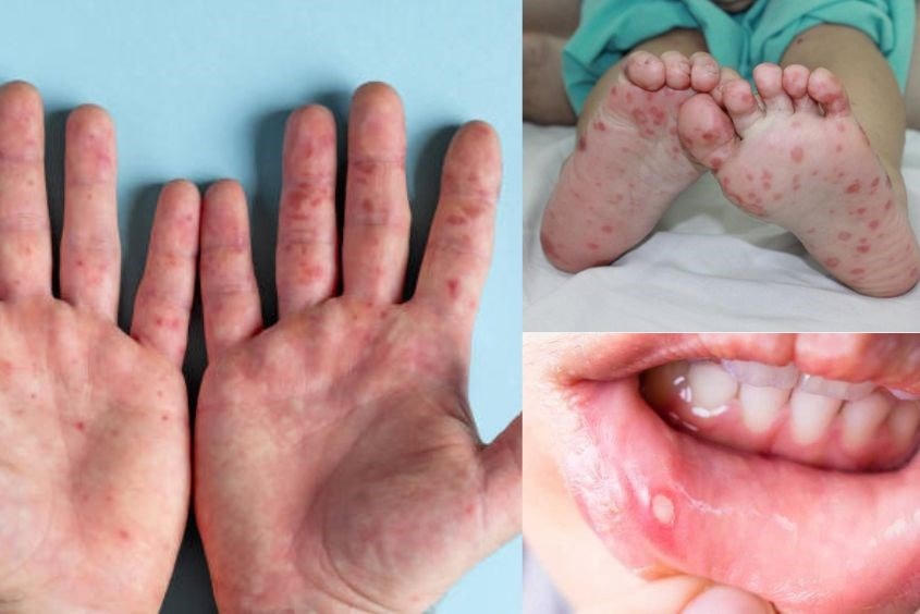 Khi mắc tay chân miệng, dấu hiệu đặc trưng của bệnh là sốt, đau họng, tổn thương niêm mạc miệng và da chủ yếu ở dạng phỏng nước thường thấy ở lòng bàn tay, lòng bàn chân, gối, mông.