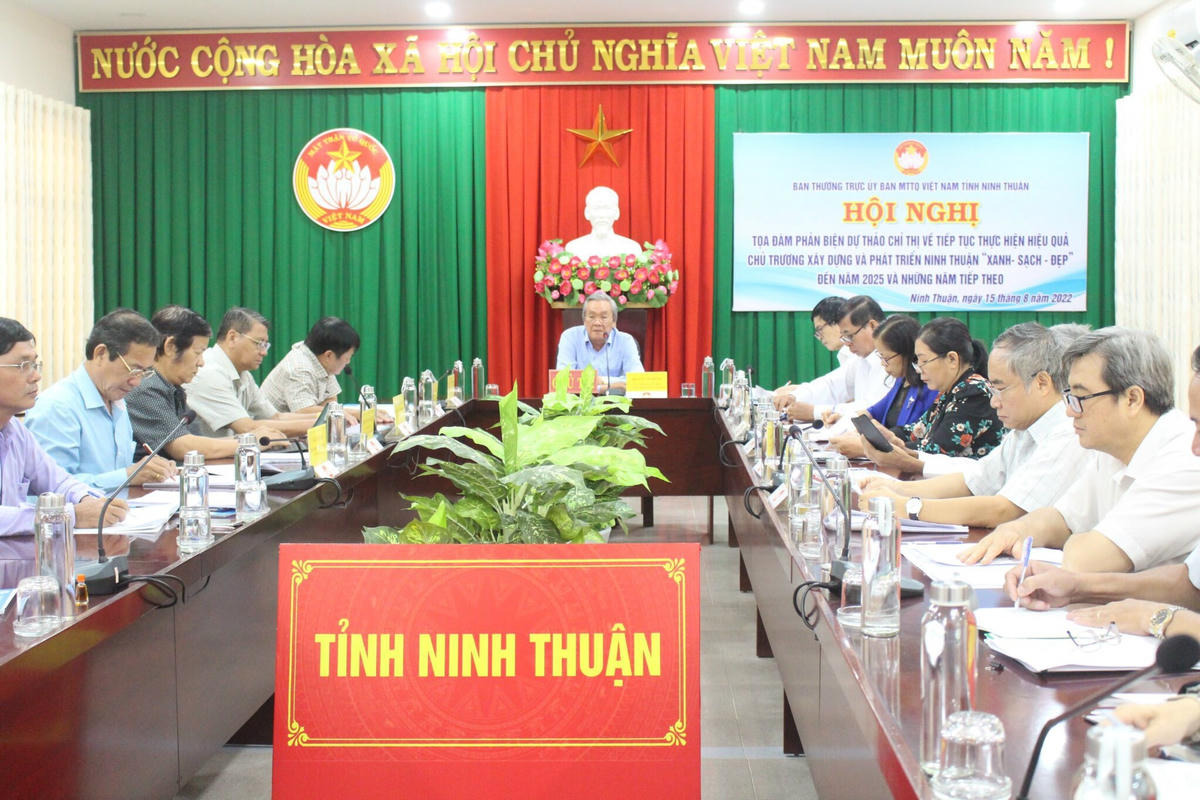 Ngày 15/8, Ủy ban MTTQ Việt Nam tỉnh Ninh Thuận, tổ chức buổi tọa đàm phản biện dự thảo Chỉ thị số 48-CT/TU của Ban Thường vụ Tỉnh ủy Ninh Thuận về tiếp tục thực hiện hiệu quả chủ trương xây dựng và phát triển Ninh Thuận “Xanh – sạch – đẹp” đến năm 2025 và những năm tiếp theo.