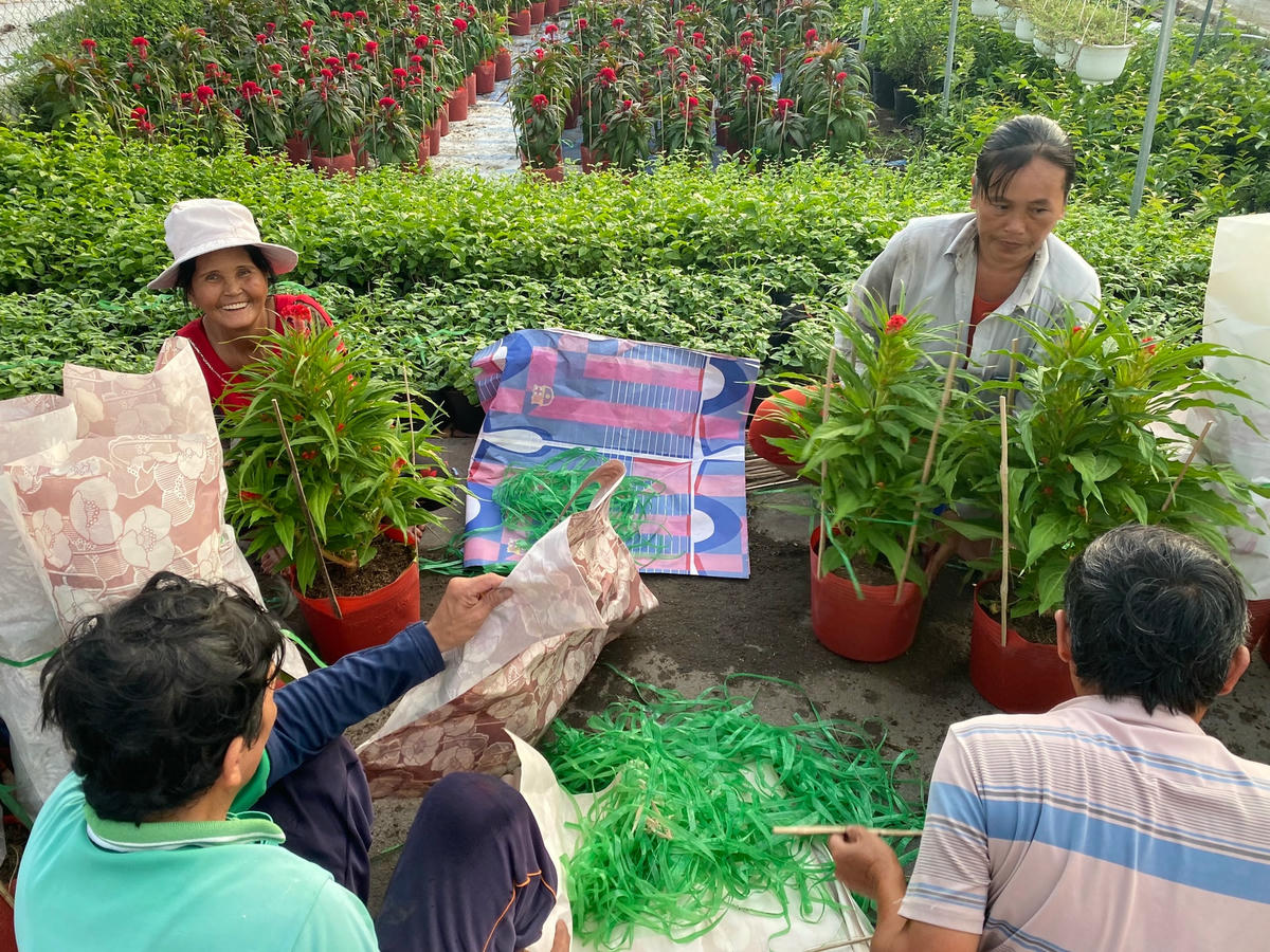 Thời gian này, đi dọc các trục đường ở huyện Chợ Lách qua các xã Vĩnh Thành, Phú Phụng, Sơn Định... là những ruộng hoa khoe sắc đủ màu của nông dân. Nhiều hộ dân đã bắt đầu gói hoa kiểng để xuất bán cho các vựa hoa tết trên TPHCM. Thông thường, hoa kiểng tết của nông dân sẽ được xuất bán cho thương lái trước tết khoảng 2 tuần. Bà Nguyễn Thị Hoa, một công nhân đang gói hoa ở xã Sơn Định cho biết mỗi chậu hoa mào gà đỏ hiện có giá 35 ngàn đồng. "Những chậu mào gà này được thương lái mua hết rồi, giờ họ đem về thành phố. Hoa giờ chưa nở nhiều đâu, phải chục ngày nữa mới đẹp. Nhưng nhiều công ty, công viên họ mua trước với số lượng lớn nên bắt đầu bán rồi. Tôi chăm sóc hoa kiểng cho chủ vựa này, mỗi ngày tiền công được 150 ngàn đồng", bà Hoa kể.