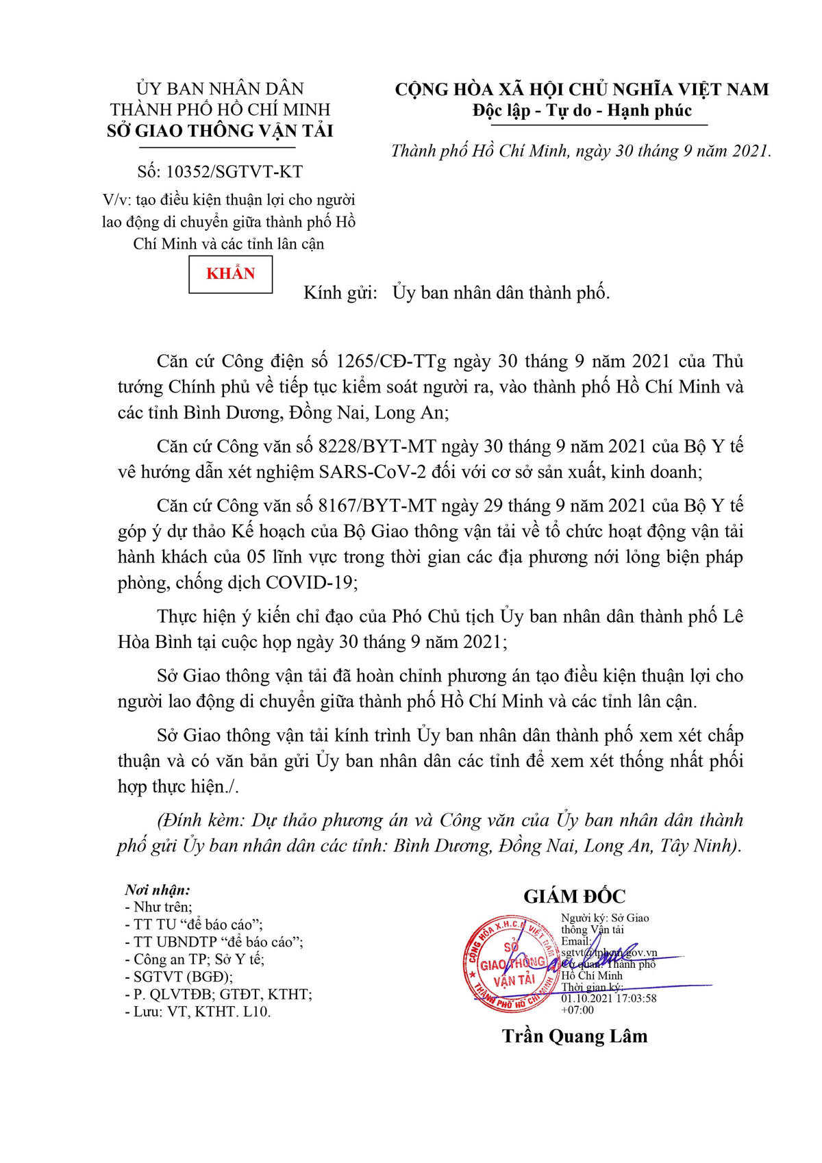 Chiều 1/10, Sở Giao thông Vận tải TP HCM công bố văn bản khẩn (số 103/SGTVT-KT) vừa được ban hành ngày 30/9/2021 về hướng dẫn tạo điều kiện thuận lợi giữa TP HCM và các tỉnh thành lân cận.