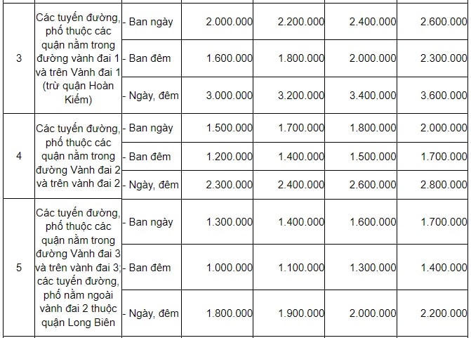 “Mức giá dịch vụ trông giữ xe ô tô đến 09 chỗ ngồi theo tháng tại các tòa nhà chung cư, trung tâm thương mại, giàn trông giữ xe hiện đại được đầu tư bằng nguồn vốn ngân sách Nhà nước (trang bị hệ thống giám sát, trông giữ xe thông minh: camera theo dõi, kiểm tra phương tiện người gửi; quản lý điểm đỗ; ra vào quẹt thẻ theo dõi giờ vào, giờ ra và tính tiền, in hóa đơn tự động, bảo hiểm gửi xe): bằng mức giá dịch vụ trông giữ xe ô tô đến 09 chỗ ngồi theo các tuyến đường, phố thuộc các quận nằm trong đường vành đai 1 và trên vành đai 1 (số thứ tự 3 tại bảng trên);