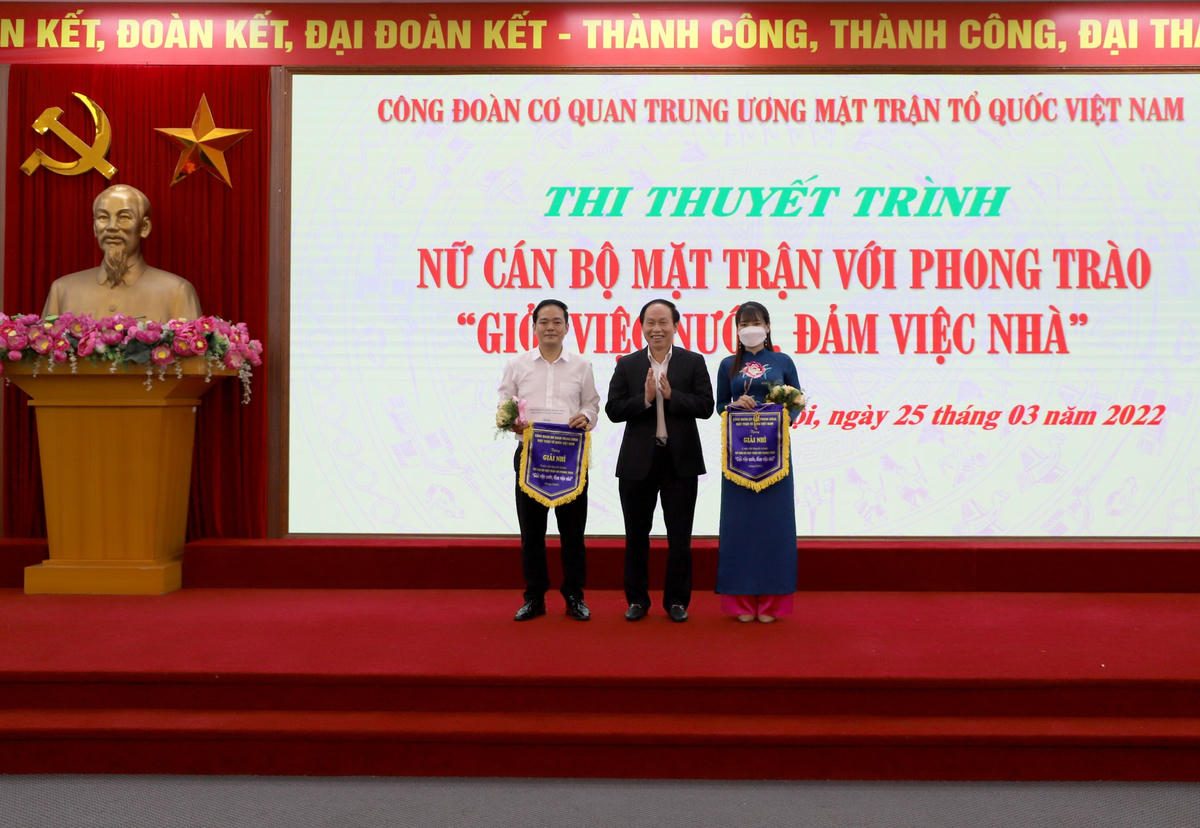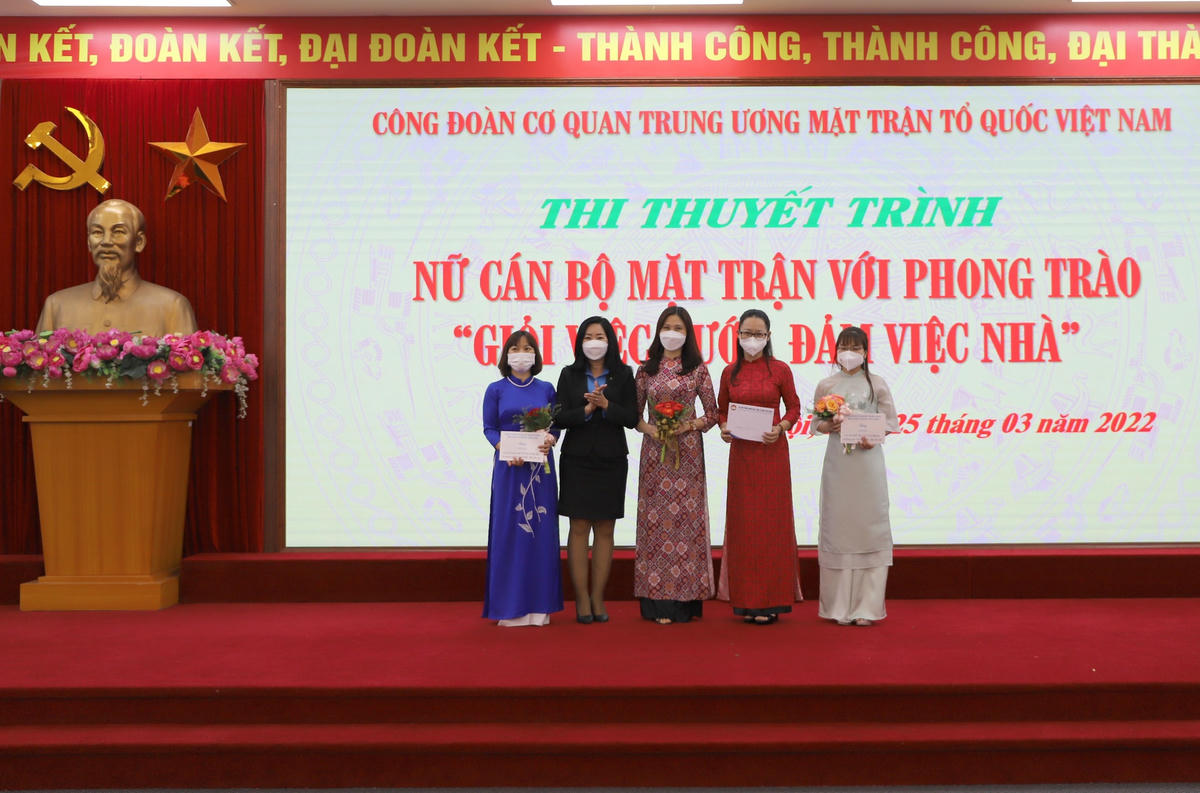 Với chủ đề “Sự động viên chia sẻ của các anh ở gia đình và tại cơ quan là yếu tố giúp chúng tôi thành công trong sự nghiệp và làm tròn thiên chức của người phụ nữ”, Công đoàn Ban Tổ chức cán bộ đã xuất sắc đạt Giải Nhất cuộc thi thuyết trình Nữ cán bộ Mặt trận với phong trào “Giỏi việc nước, đảm việc nhà” sau hai phần thi bình chọn trực tuyến và thuyết trình trực tiếp.
