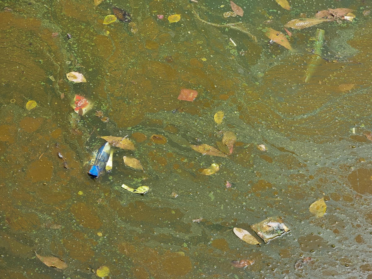 Trong sáng 3/10, mặt nước hồ này có màu khác thường, tạo thành váng màu nâu vàng và rác thải nổi trên mặt nước.