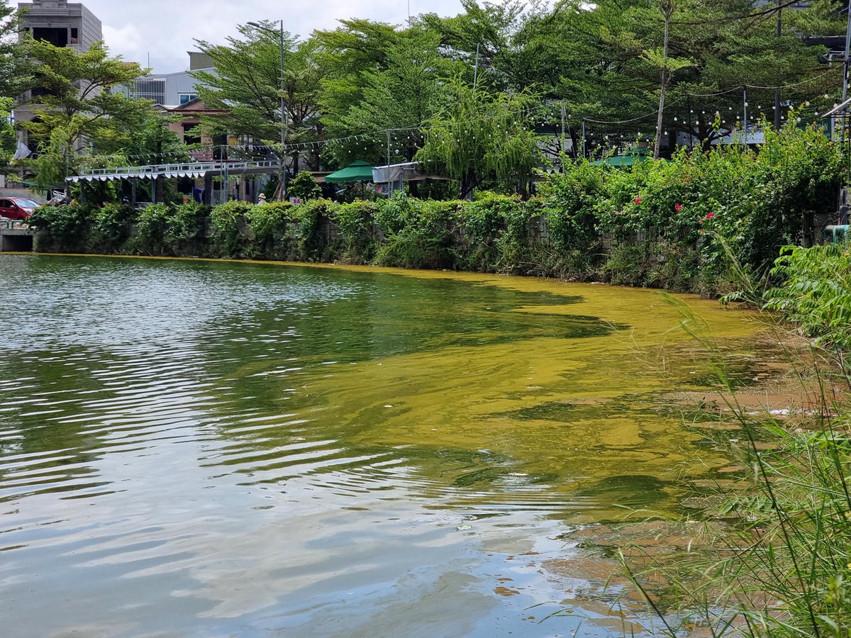 Tình trạng nước đổi màu chỉ xuất hiện ở một số khu vực thuộc góc hồ, trong khi đó tại mặt nước ở giữa hồ thì vẫn có màu bình thường.