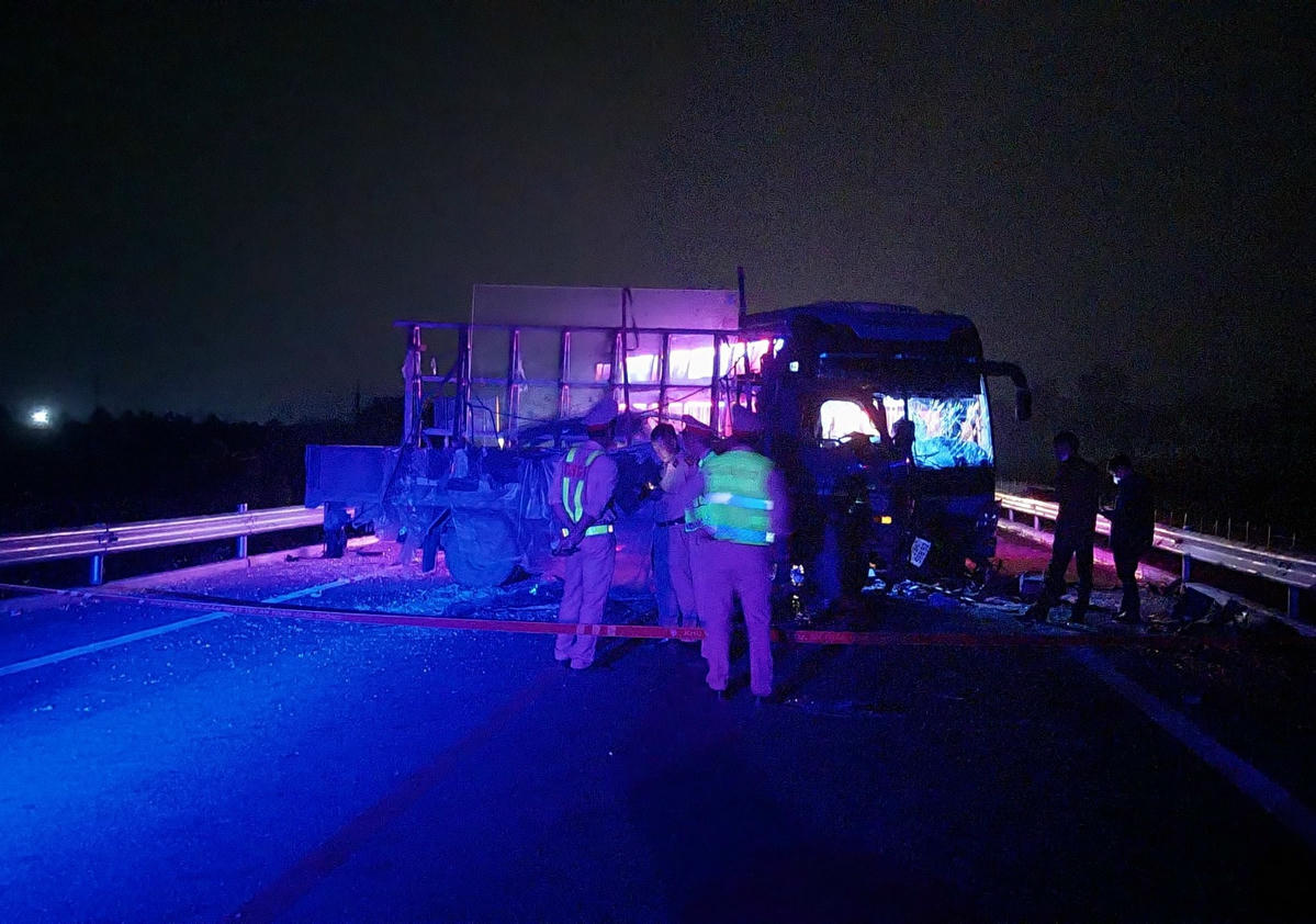 Cú tông mạnh, khiến phần đầu của 2 xe bị biến dạng, kính chắn gió vỡ nát. Tài xế ô tô tải mắc kẹt trong cabin, trong khi nhiều hành khách trên xe giường nằm hoảng loạn.