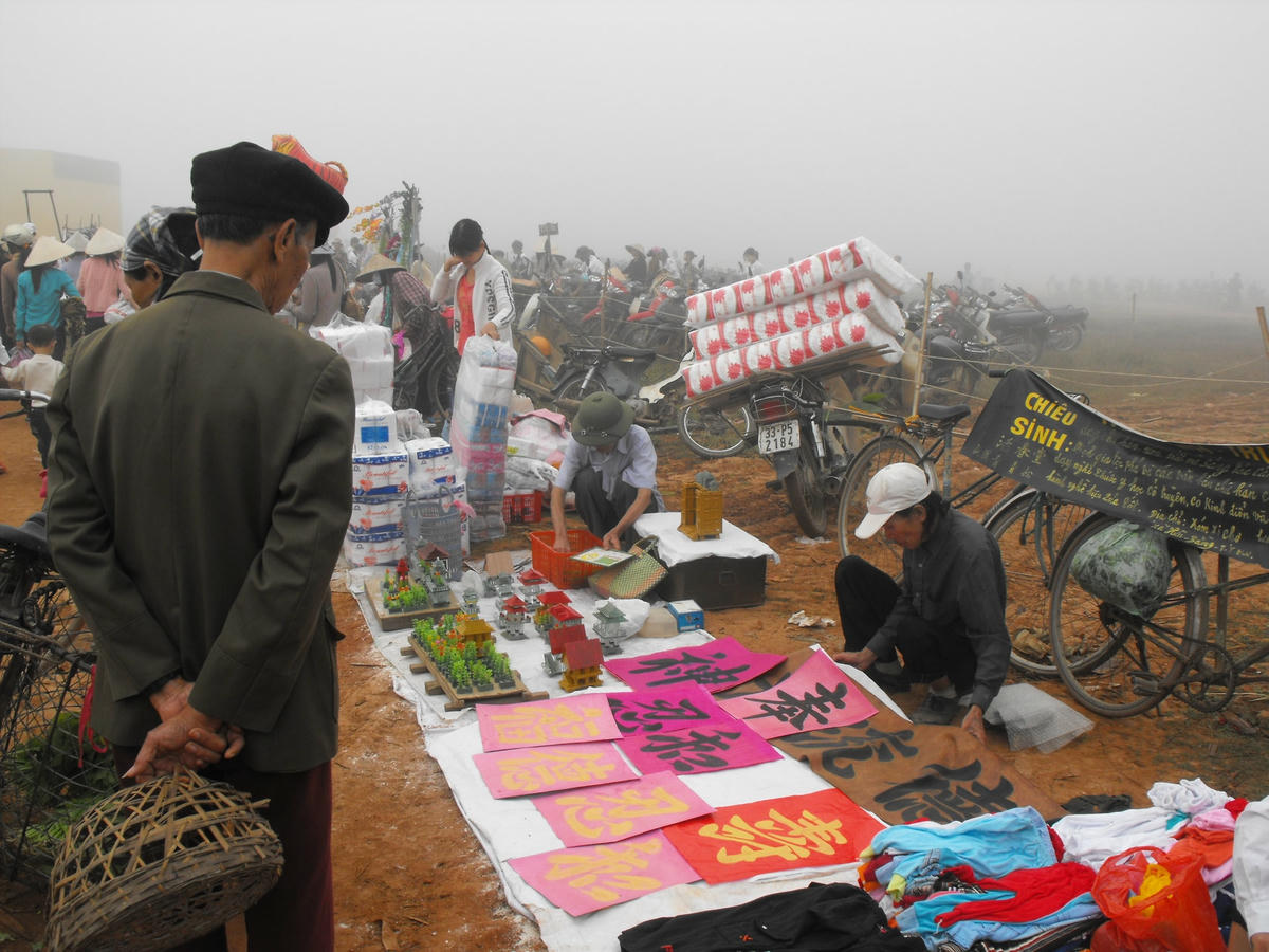 Tránh xa những âm thanh hỗn độn của hàng gà vịt, ngan ngỗng và hàng quán ồn ã của phiên chợ tháng Chạp, ông lặng lẽ chọn một khoảng trống ở ngay cổng chợ quê.