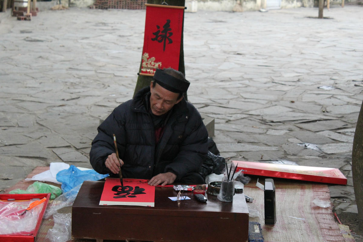 Ông vẫn đang soạn đồ nghề để cho một ngày mưu sinh. Gia tài ông thật khiêm nhường, chỉ có vài chiếc bút lông to nhỏ khác nhau, tập giấy đỏ và nghiên mực. Thế nhưng ông có sức hút kỳ lạ với người dân quê, đặc biệt vào dịp chợ tết. Bên trong cái dáng gầy gò, tấm lưng còng, là cái bồ chữ người ta có thể xin mang về trang hoàng trong nhà, để có thêm nguồn sinh lực khi mùa xuân đang đến.