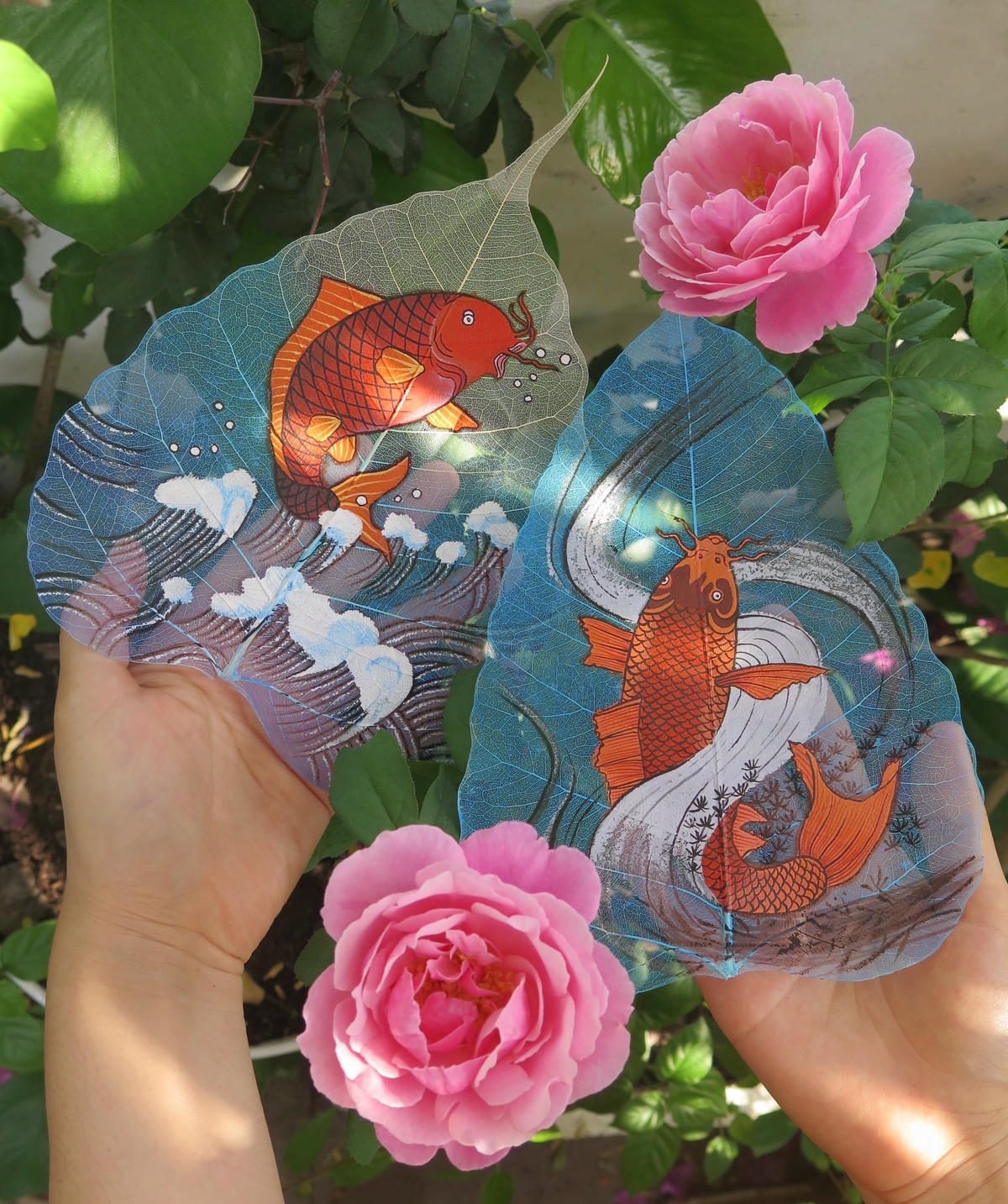 “Văn hóa dân gian Việt Nam xem cá chép biểu trưng cho việc vượt lên khó khăn, thử thách, vươn tới thành công. Cùng với tranh cá chép đỏ, mình cũng vẽ những tranh dân gian như cá chép ngắm trăng, cá chép vượt vũ môn trên xương lá và nhận được nhiều sự yêu mến”, Hương Nhiên nói với Đại Đoàn Kết Online.
