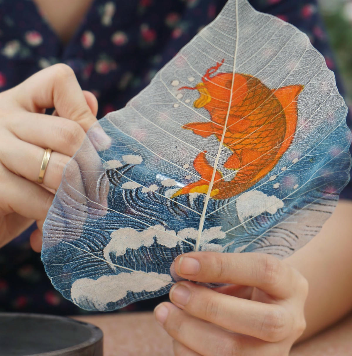 Xuất phát từ mong muốn gìn giữ nét văn hóa Á Đông, Dương Hương Nhiên (32 tuổi, TP HCM) đã tìm cách phác thảo hình ảnh cá chép "vượt vũ môn" trên xương lá bồ đề nhân dịp đưa tiễn ông Công, ông Táo về trời.