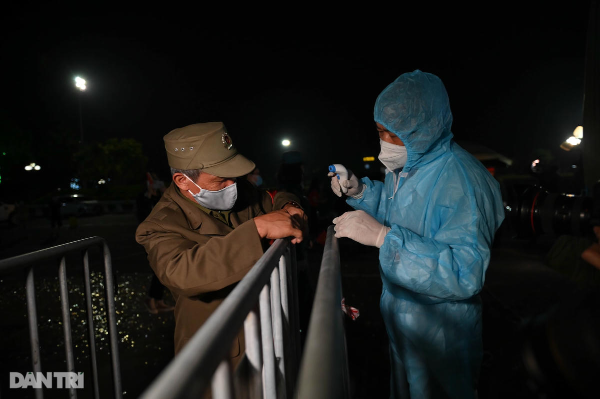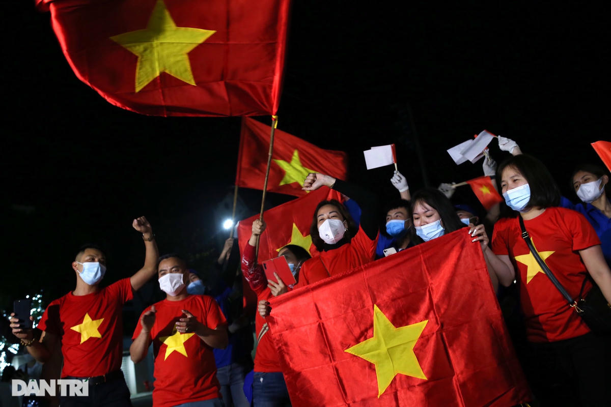 Đội tình nguyện viên của bếp ăn "dã chiến" phục vụ hàng chục nghìn suất cơm những ngày qua cho khu cách ly tập trung cũng có mặt, rực rỡ màu cờ đỏ sao vàng.