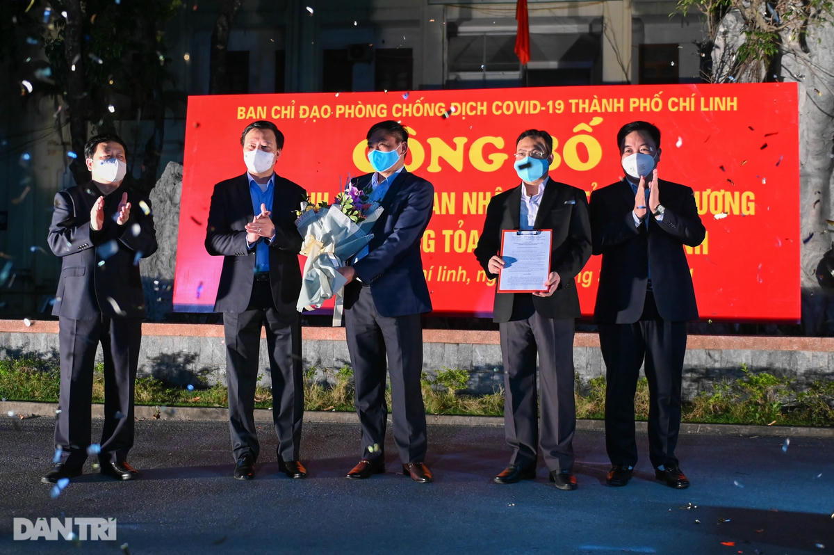 11h30 đêm 2/3, đại diện lãnh đạo tỉnh tặng hoa cho cán bộ tại chốt kiểm dịch và thực hiện lệnh gỡ rào phong tỏa TP Chí Linh.