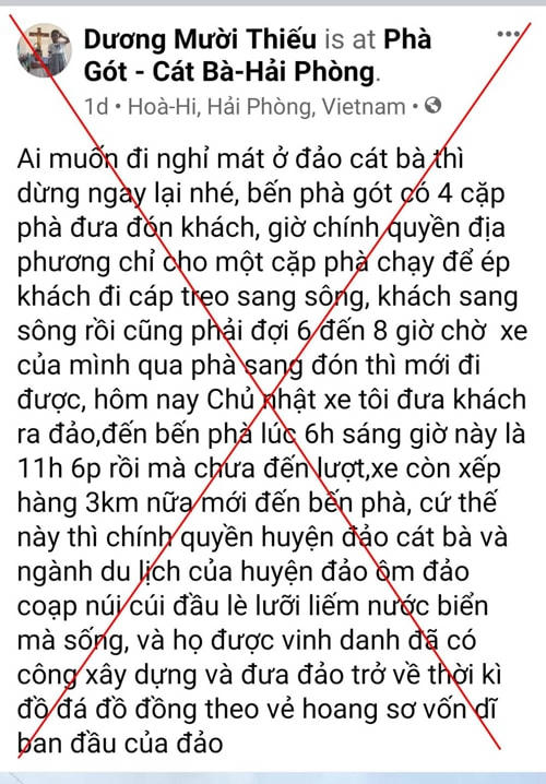 “Ai muốn đi nghỉ mát ở đảo Cát Bà thì dừng ngay nhé, bến phà Gót có 4 cặp phà đưa đón khách, giờ chính quyền địa phương chỉ cho một cặp phà chạy để ép khách đi cáp treo sang sông, khách sang sông rồi cũng phải đợi 6 đến 8 giờ chờ xe của mình qua phà sang đón thì mới đi được, hôm nay Chủ nhật xe tôi đưa khách ra đảo, đến bến phà lúc 6h sáng giờ này là 11h6p rồi mà chưa đến lượt, xe còn xếp hàng 3 km nữa mới đến bến phà, cứ thế này thì chính quyền huyện đảo cát bà và ngành du lịch của huyện đảo ôm đảo coạp núi cúi đầu lè lưỡi liếm nước biển mà sống, và họ được vinh danh đã có công xây dựng và đưa đảo trở về thời kì đồ đá đồ đồng theo vẻ hoang sơ vốn dĩ ban đầu của đảo“.