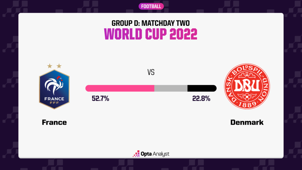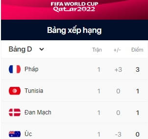Tuyển Pháp nhiều khả năng sẽ giành một suất vào vòng loại trực tiếp của World Cup 2022, khi họ tiếp Đan Mạch trong khuôn khổ bảng D, tại sân vận động 974 vào 23h tối 26/11 (theo giờ Việt Nam).