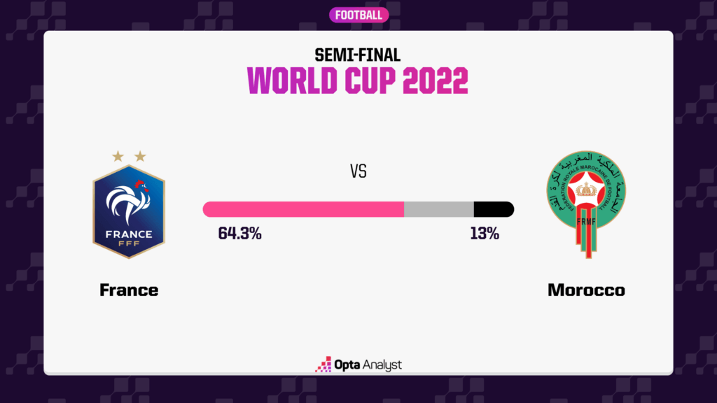 Quá nhiều yếu tố thuận lợi nên không có gì ngạc nhiên khi Les Bleus được mô hình dự đoán Opta đánh giá cao hơn về tỉ lệ thắng: 64,3%. So với trận gặp Bồ Đào Nha, Morocco còn có tỉ lệ thắng thấp hơn: 13% so với 18,8%. Khả năng hòa và bước vào hiệp phụ của hai đội được dự đoán chiếm 22,7%.