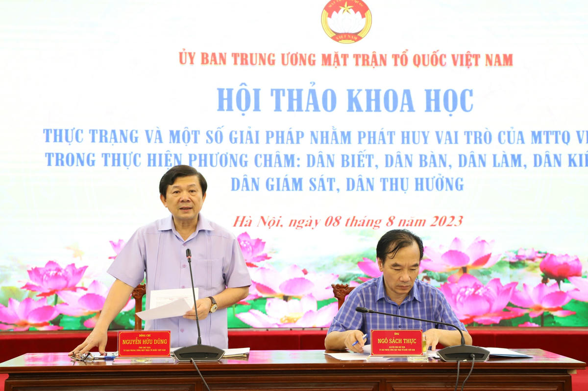 Cũng theo Phó Chủ tịch Nguyễn Hữu Dũng, tham luận tại Hội thảo đã làm rõ vai trò “nòng cốt” của MTTQ Việt Nam, các tổ chức chính trị- xã hội và nhân dân trong phát huy thực hiện phương châm “Dân biết, dân bàn, dân làm, dân kiểm tra, dân giám sát, dân thụ hưởng”. Cùng với đó, MTTQ Việt Nam cùng nhân dân tham gia góp ý xây dựng Đảng, xây dựng chính quyền, tham gia các hoạt động giám sát và phản biện xã hội, đại diện, bảo vệ quyền và lợi ích hợp pháp, chính đáng của nhân dân; Tổ chức việc tiếp dân, tiếp nhận, tổng hợp khiếu nại, tố cáo, phản ánh, kiến nghị của nhân dân để chuyển đến cơ quan nhà nước có thẩm quyền theo quy định của pháp luật; giám sát quá trình giải quyết khiếu nại, tố cáo, phản ánh, kiến nghị của nhân dân…