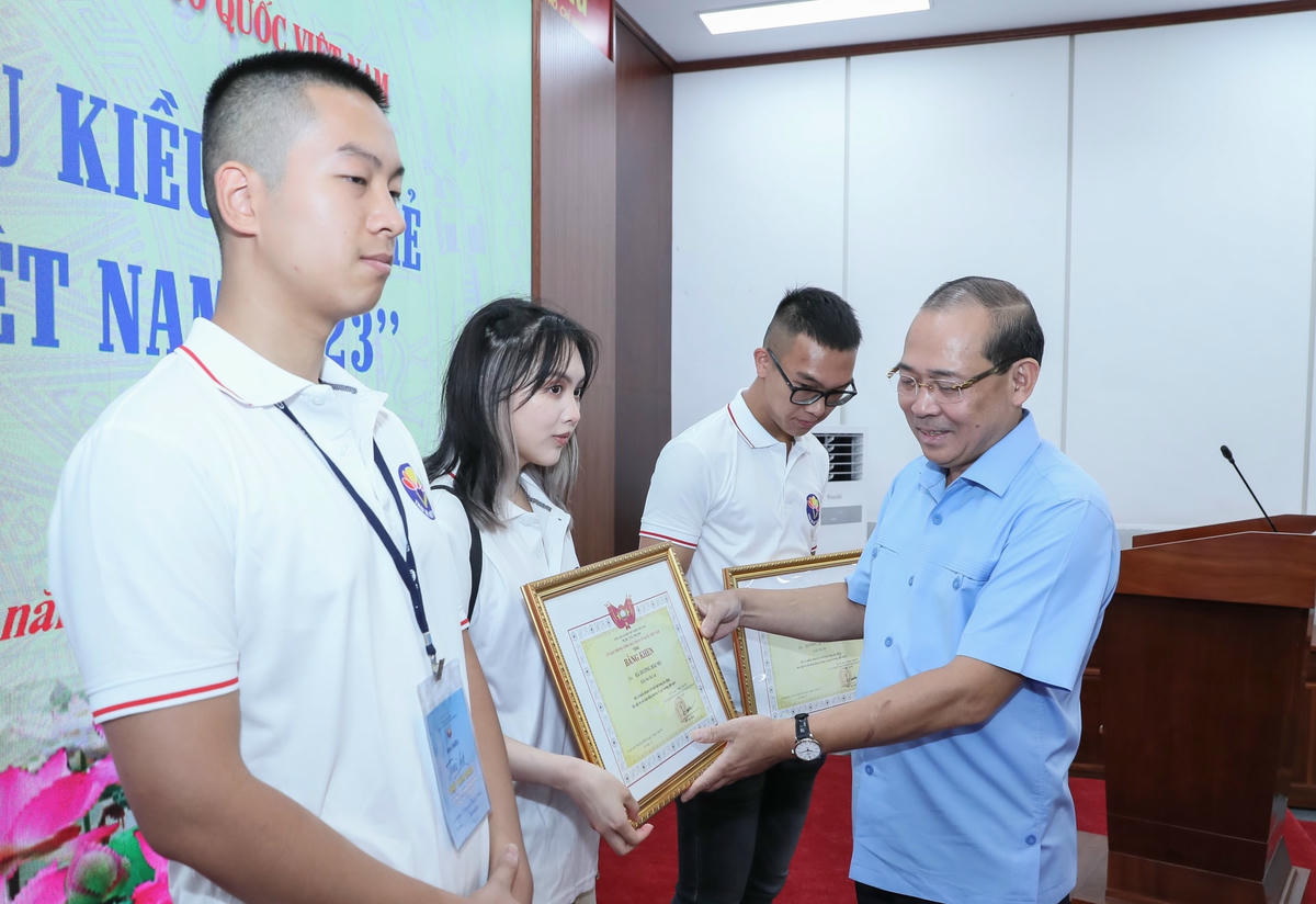 Nhân dịp này, Phó Chủ tịch Hoàng Công Thủy đã trao Bằng khen của UBTƯ MTTQ Việt Nam và tặng Biểu trưng MTTQ Việt Nam cho các kiều bào trẻ đã có thành tích nổi bật trong lao động, học tập và các hoạt động hướng về quê hương, đất nước.