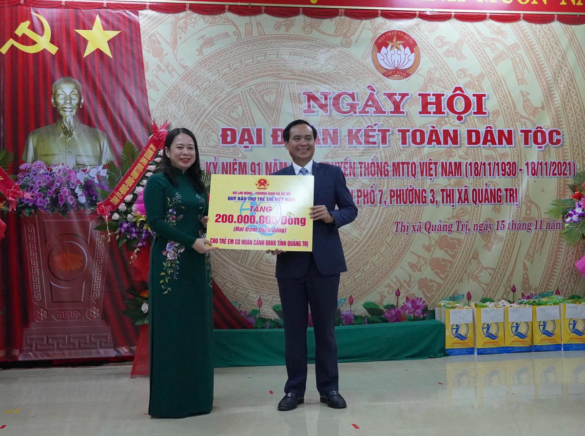 Dịp này, Phó Chủ tịch nước Võ Thị Ánh Xuân đã trao tặng phần quà trị giá 200 triệu đồng cho Quỹ Bảo trợ trẻ em tỉnh Quảng Trị để hỗ trợ cho các trẻ em có hoàn cảnh đặc biệt khó khăn. Bên cạnh đó, Phó Chủ tịch nước còn trao thêm 35 suất quà cho các gia đình chính sách và trẻ em có hoàn cảnh khó khăn tại thị xã Quảng Trị.