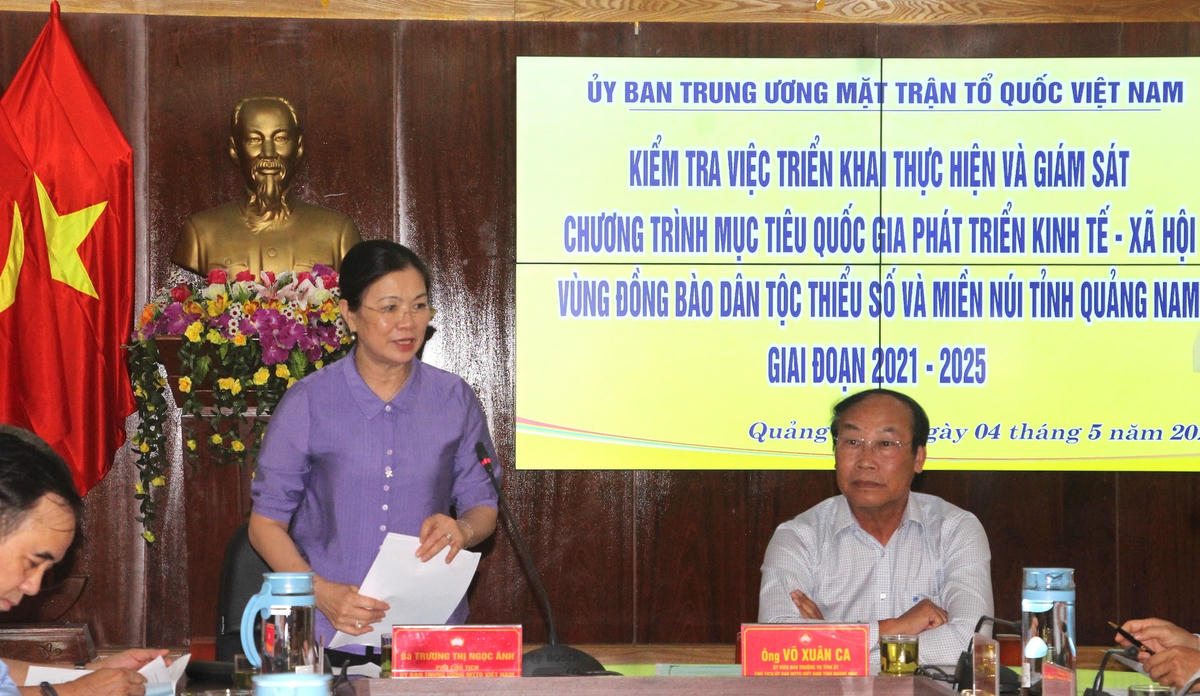 Phát biểu tại buổi kiểm tra, bà Trương Thị Ngọc Ánh, Phó Chủ tịch UBTƯ MTTQ Việt Nam đánh giá cao vai trò của MTTQ Việt Nam tỉnh Quảng Nam thời gian qua đã triển khai thực hiện và giám sát Chương trình mục tiêu quốc gia phát triển KT - XH vùng đồng bào DTTS và miền núi giai đoạn 2021- 2025 trên địa bàn tỉnh.