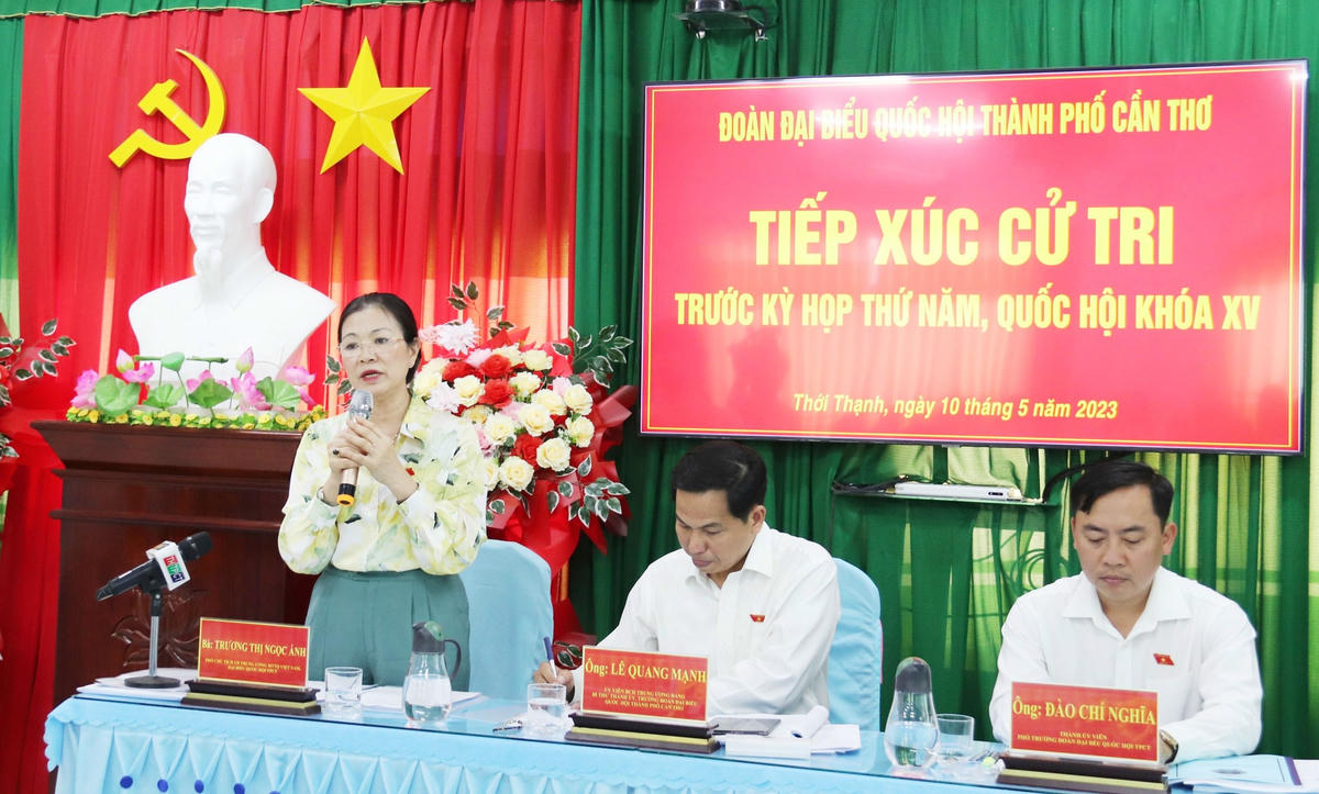 Tại phường Thới An, quận Ô Môn, Phó Chủ tịch Ủy ban Trung ương MTTQ Việt Nam Trương Thị Ngọc Ánh thay mặt Đoàn ĐBQH TP Cần Thơ báo cáo với cử tri về dự kiến nội dung chương trình kỳ họp thứ năm, Quốc hội khóa XV và hoạt động của Đoàn ĐBQH TP Cần Thơ tại địa phương từ đầu năm 2023 đến nay.