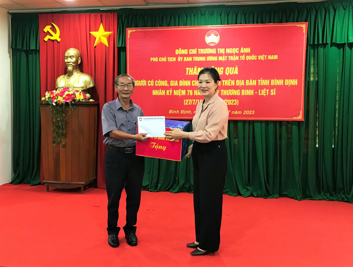 Nhân kỷ niệm 76 năm Ngày Thương binh Liệt sĩ (27/7/1947-27/7/2023), ngày 27/7, Phó Chủ tịch Ủy ban Trung ương MTTQ Việt Nam Trương Thị Ngọc Ánh và Đoàn công tác UBTƯ MTTQ Việt Nam đã đến thăm Trung tâm Chăm sóc và Điều dưỡng Người có công Bình Định. Thăm và tặng quà động viên gia đình chính sách và người có công trên địa bàn tỉnh Bình Định.