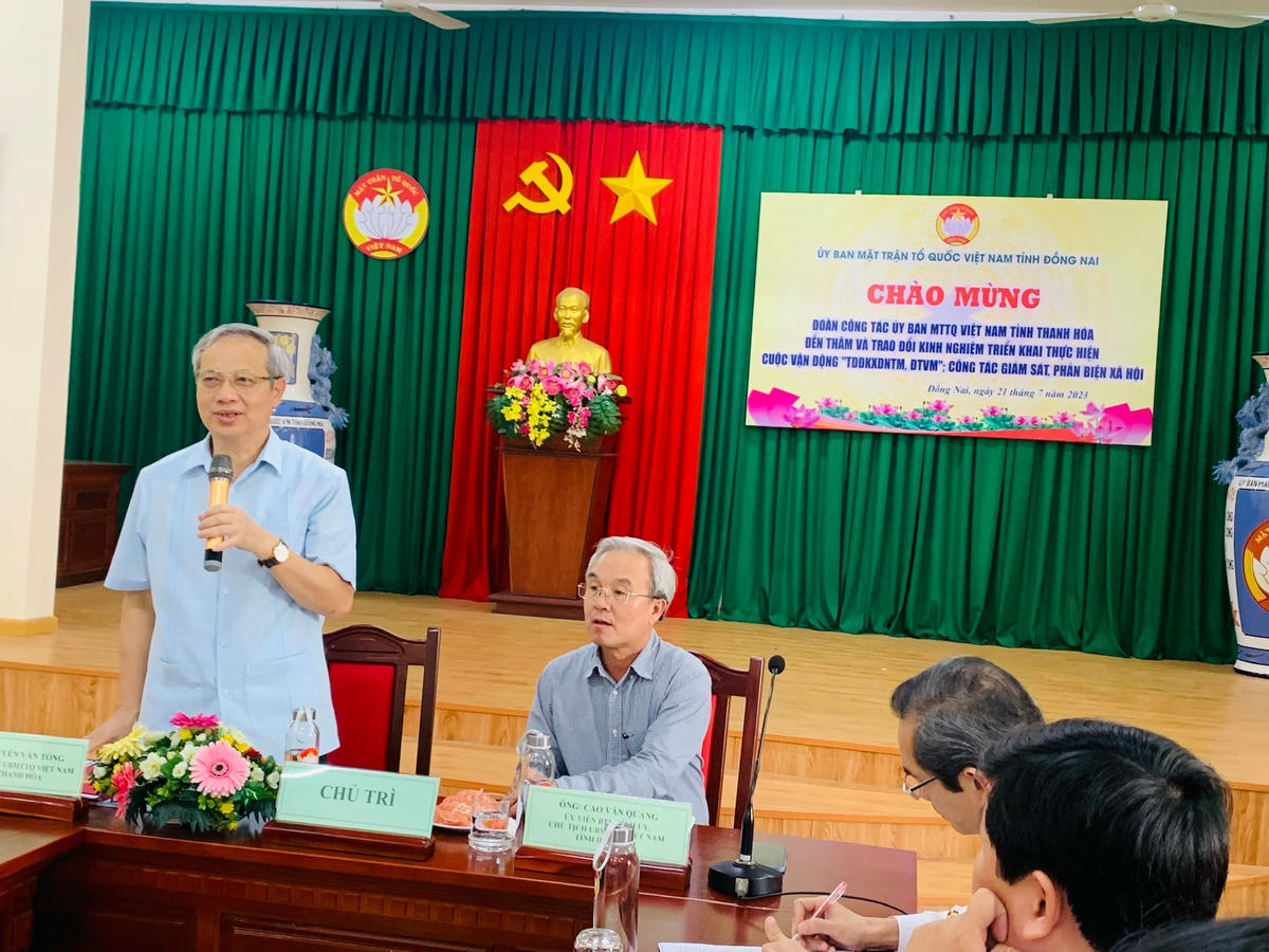 Hôm qua, 21/7, Chủ tịch Ủy ban MTTQ Việt Nam tỉnh Đồng Nai Cao Văn Quang đã chủ trì buổi làm việc với đoàn công tác do Phó chủ tịch Ủy ban MTTQ Việt Nam tỉnh Thanh Hóa Nguyễn Văn Tòng làm trưởng đoàn đến trao đổi kinh nghiệm nâng cao chất lượng triển khai Cuộc vận động “Toàn dân đoàn kết xây dựng nông thôn mới, đô thị văn minh” và công tác giám sát và phản biện xã hội.