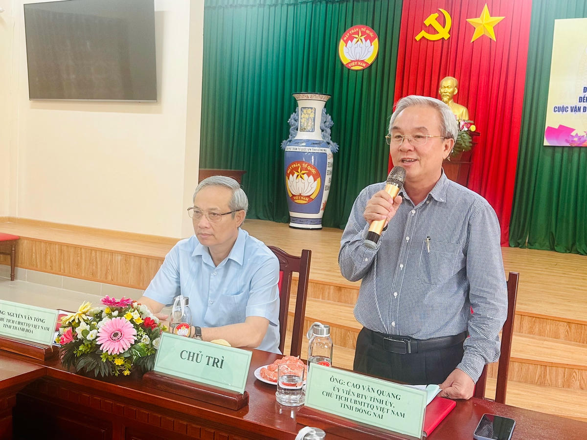 Chủ tịch Ủy ban MTTQ Việt Nam tỉnh Đồng Nai Cao Văn Quang khẳng định, sẽ tạo mọi điều kiện để đoàn công tác Ủy ban MTTQ Việt Nam tỉnh Thanh Hóa tìm hiểu các mô hình, cách làm hay về triển khai Cuộc vận động “Toàn dân đoàn kết xây dựng nông thôn mới, đô thị văn minh” trong thời gian đoàn làm việc tại địa phương.