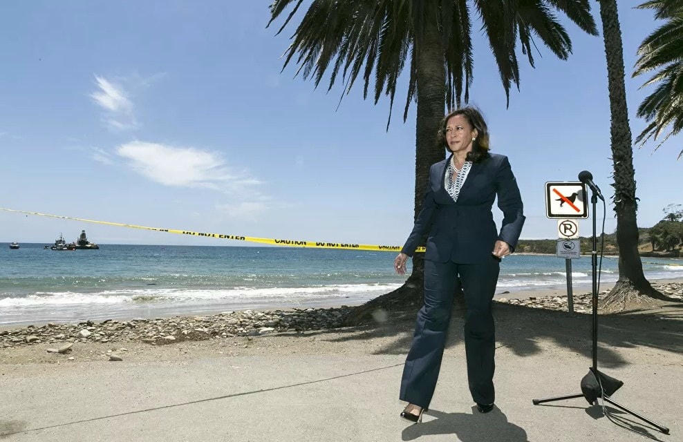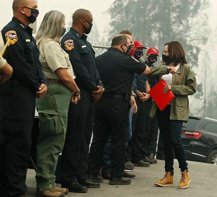 Bộ trưởng Tư pháp California khi đó là Kamala Harris mặc một chiếc váy bodycon satin một bên vai thanh lịch tại Showtime's 2012 "EMMYEVE" Soiree được tổ chức tại Sunset Tower vào ngày 22/9/2012 ở Tây Hollywood, California. Những bộ trang phục đơn sắc, chẳng hạn như một chiếc áo khoác đen thông minh trên cùng một chiếc áo sơ mi trắng, dường như được bà Harris ưa chuộng không kém, và là một trang phục giản dị phù hợp với bà. Bà Harris tại một cuộc vận động tranh cử ở Miami - một chiếc áo blazer kết hợp với quần jean bó, một đôi giày Converse đi kèm một chuỗi ngọc trai thể hiện sự vui tươi và tự tin. Bà Harris, năm 2014, khi đó là Tổng chưởng lý của California, mặc một chiếc váy dạ tiệc bó sát lấp lánh, trang trí bằng sequins và hoàn chỉnh với một đường viền cổ đẹp trong lễ trao Giải thưởng Hình ảnh NAACP lần thứ 45 do TV One tổ chức tại Pasadena Civic Auditorium. Kamala Harris năm 2004 khi còn là luật sư Quận San trong bộ vest đen, được làm nổi bật bằng một chuỗi ngọc trai trắng và một chiếc áo phông trắng. Luật sư Douglas Emhoff (L) và Tổng chưởng lý California Kamala Harris tham dự Tiệc trao giải Oscar 2015 Vanity Fair do Graydon Carter tổ chức tại Trung tâm Biểu diễn Nghệ thuật Wallis Annenberg vào ngày 22/2/2015 ở Beverly Hills, California. Harris đang mặc một chiếc váy bodycon nửa đêm màu xanh và đen dài đến sàn, với phần trên và vòng eo xuyên thấu. Bộ trưởng Tư pháp California Kamala Harris trong chuyến công tác dọn dẹp dầu tràn tại Bãi biển Refugio State, phía bắc Goleta, California, ngày 4/6/2015, mặc một bộ quần áo dài, giày cao gót và vòng cổ ngọc trai. Sự lựa chọn quần áo của Harris cho đêm bầu cử được các tạp chí thời trang coi là biểu tượng đặc biệt, vì cô ấy chọn mặc một bộ đồ Carolina Herrera màu trắng, bề ngoài là để phù hợp với màu sắc mà người Suffraget yêu thích khi họ ủng hộ quyền bầu cử. Trong ngày diễn ra Hội nghị Quốc gia của đảng Dân chủ tại Nhà thi đấu cáp Time Warner vào ngày 4/9/2012 ở Charlotte, Bắc Carolina, Bộ trưởng Tư pháp California khi đó là Kamala Harris đứng trên bục trong bộ váy họa tiết houndstooth, kết hợp với một đôi cổ điển máy bơm bằng sáng chế. Ứng cử viên Phó Tổng thống của đảng Dân chủ, Thượng nghị sĩ Kamala Harris, D-California, chạm khuỷu tay vào những người phản ứng đầu tiên khi cô được thông báo tóm tắt về Vụ cháy Creek tại trường tiểu học Pine Ridge, ngày 15/9/2020 ở Auberry, California. Harris với một chiếc áo khoác bình thường- quần jean, hoàn chỉnh với bốt Timberland màu nâu cổ điển. Sau đó, ứng cử viên tổng thống của đảng Dân chủ, Thượng nghị sĩ Kamala Harris, D-Calif, đến Nhà hàng Common Man để ăn trưa ở Concord, NH, ngày 18/2/2019, trong chiếc áo khoác màu xám sẫm, kết hợp với giày thể thao được nhiều người yêu thích - đế trắng lần này. Một chuỗi ngọc trai đen thường đeo của cô cũng được đeo trên cổ.