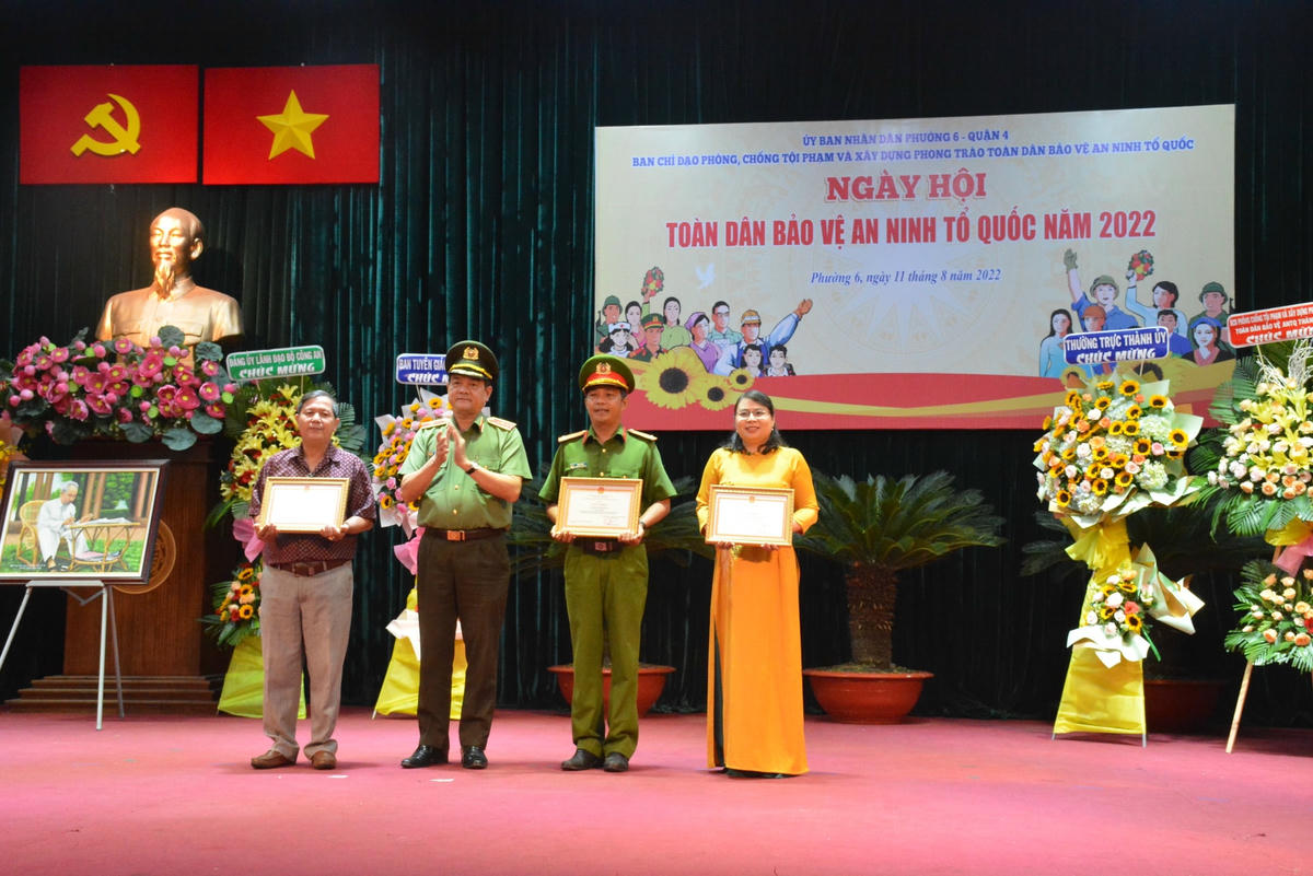 Tại ngày hội, Ban tổ chức đã trao nhiều bằng khen, giấy khen của Bộ Công an, Công an TP HCM, UBND quận 4 và phường 6 cho các tập thể, cá nhân có thành tích trong phong trào toàn dân bảo vệ an ninh Tổ quốc. Đồng thời, Ban tổ chức cũng trao nhiều phần quà cho các hộ dân có hoàn cảnh khó khăn trên địa bàn phường 6, quận 4, TP HCM./.