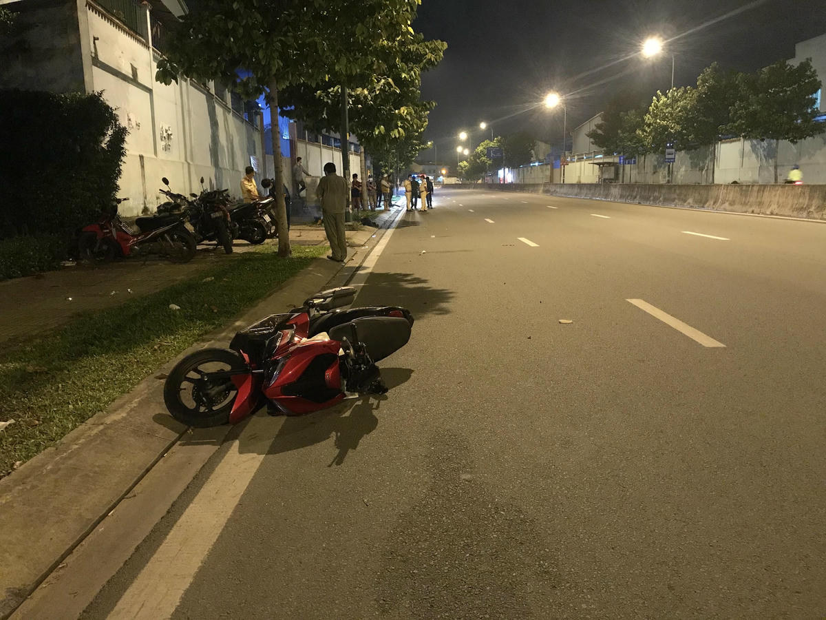 Do chạy xe với tốc độ nhanh khiến anh Thịnh lao về trước rồi văng lên lề đường tử vong tại chỗ. Riêng chiếc xe máy trượt dài đến khoảng 20 m.