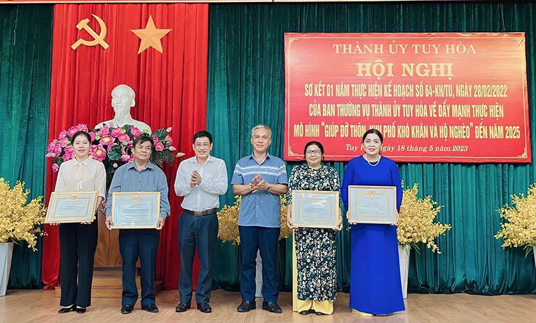 Nhân dịp này, Ban Thường vụ Thành ủy Tuy Hòa tặng giấy khen cho 2 tập thể và 2 cá nhân có thành tích xuất sắc qua 1 năm thực hiện mô hình Giúp đỡ thôn, khu phố khó khăn và hộ nghèo đến năm 2025 tại địa phương.
