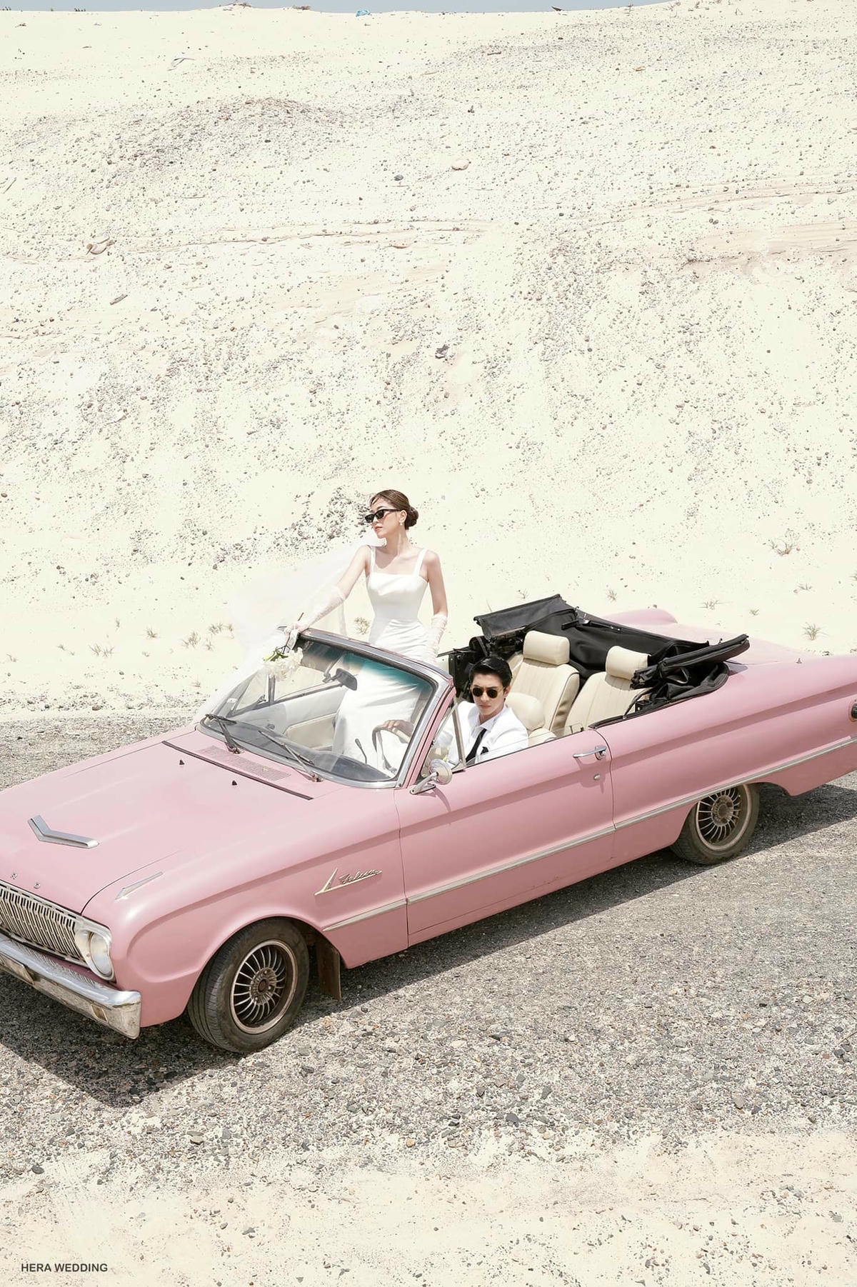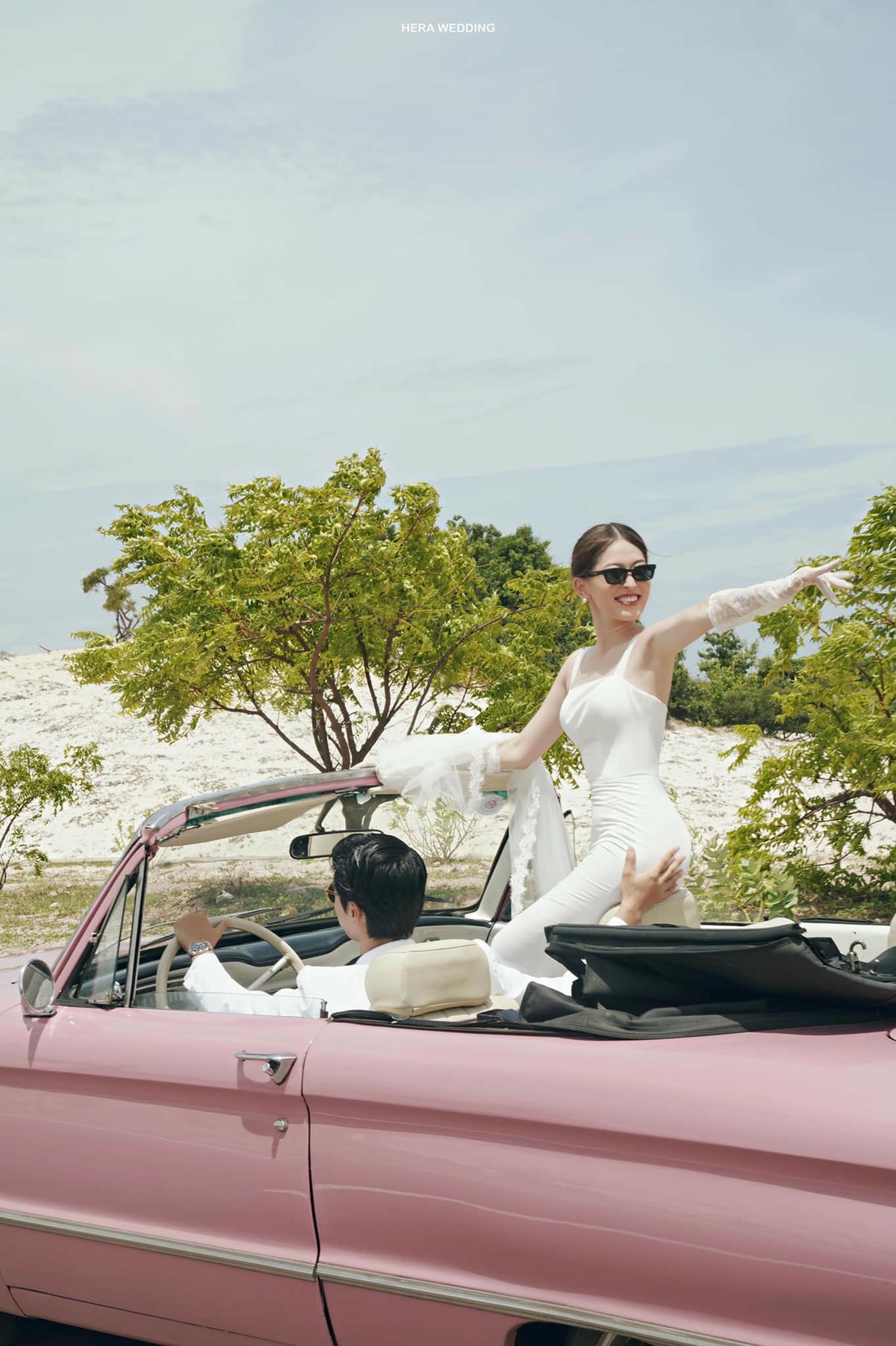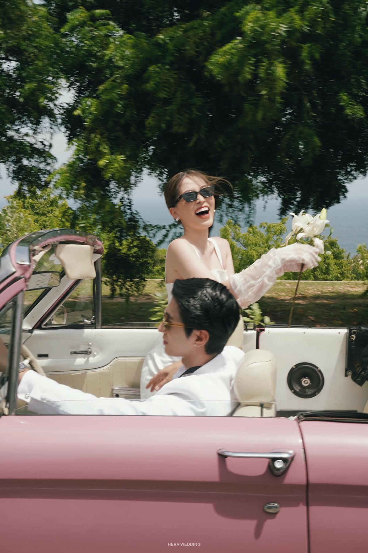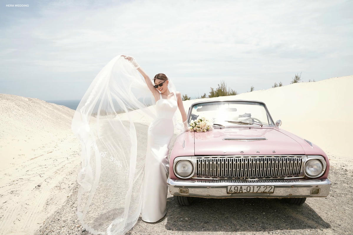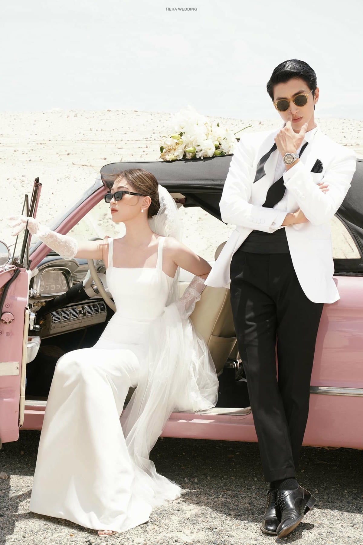 Mới đây, cặp đôi vừa tung loạt hình cưới đốn tim người hâm mộ. Cặp sao thoải mái tạo dáng trên chiếc xe mui trần. Trong ảnh, Phương Nga diện váy trắng tinh khôi còn chú rể Bình An lại điển trai, lịch lãm trong vest trắng, quần đen.