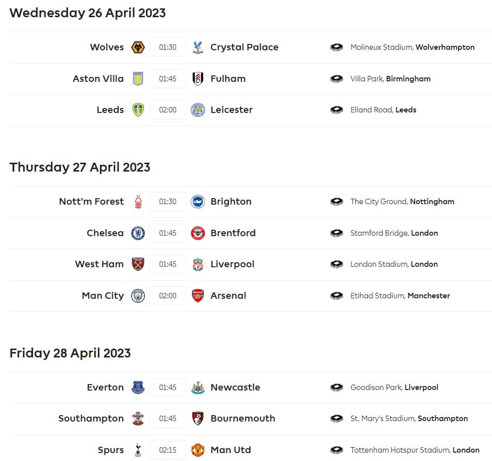Vòng 33 Premier League 2022/23 sẽ diễn ra vào rạng sáng các ngày 26,27 và 28/4 theo giờ Việt Nam.