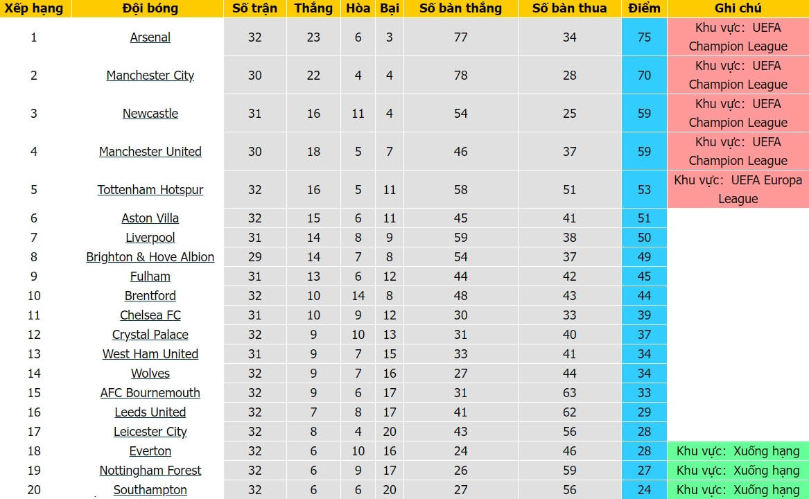 Arsenal vẫn hơn Man City 5 điểm nhưng đã chơi hơn 2 trận. Dù vậy, nếu “Pháo thủ” tránh được thất bại tại Etihad, họ sẽ gây thêm áp lực buộc Man City phải giành chiến thắng trong các trận còn lại.
