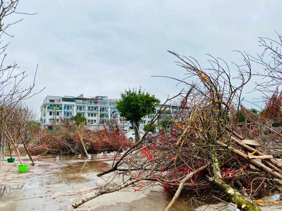 Hàng loạt cành đào đủ kích cỡ to, nhỏ bị chặt bỏ lại.