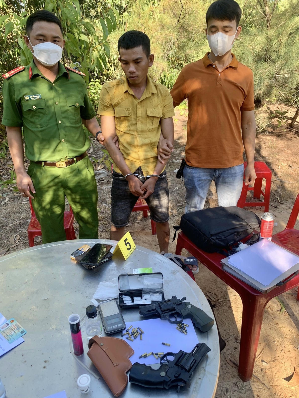 Tại thời điểm bắt giữ đối tượng Tài, lực lượng chức năng kiểm tra trên người và trong túi xách của Tài có 2 vật nghi súng có 22 viên đạn, một túi nilon và 6 gói chứa chất tinh thể màu trắng, một cân tiểu ly, một bình gas mini và một số dụng cụ nghi vấn dùng để sử dụng ma túy.