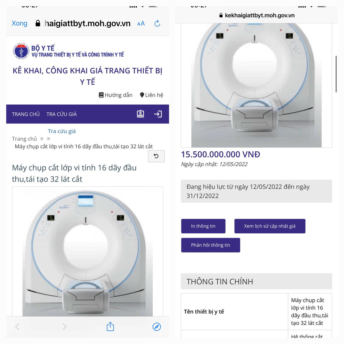 Riêng máy CT 32 lát cắt có cùng model, hãng sản xuất và cấu hình của bệnh viện đang sử dụng, đã được công ty nhập khẩu do hãng ủy quyền kê khai giá theo quy định của Nghị định 98 trên cổng của Bộ Y tế cho phép giá bán cuối cùng là 15,5 tỷ đồng”.