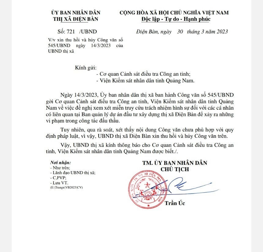 Cụ thể Công văn số 721/UBND do ông Trần Úc, Chủ tịch UBND thị xã Điện Bàn ký, nêu: “Ngày 14/3/2023, UBND thị xã Điện Bàn ban hành Công văn số 545/UBND gửi Cơ quan CSĐT Công an tỉnh, VKSND tỉnh Quảng Nam đề nghị xem xét miễn truy cứu trách nhiệm hình sự đối với các cá nhân có liên quan tại Ban quản lý (BQL) dự án đầu tư xây dựng thị xã Điện Bàn để xảy ra những vi phạm trong công tác đấu thầu. Tuy nhiên, qua rà soát, xét thấy nội dung Công văn chưa phù hợp với định của pháp luật. Vì vậy, UBND thị xã Điện Bàn xin thu hồi và hủy Công văn trên”.