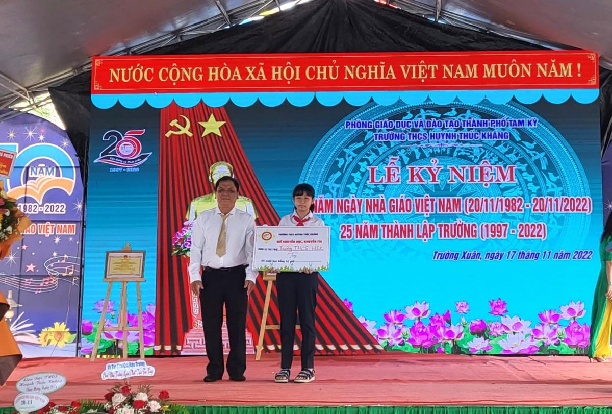 Tại Lễ kỷ niệm, nhóm cựu học sinh của Trường THCS Huỳnh Thúc Kháng, TP Tam Kỳ đã tặng 25 suất học bổng cho các em học sinh nghèo của nhà trường.