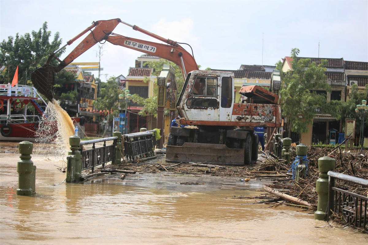 Ghi nhận của chúng tôi, từ chiều 18/10, nước lũ đã bắt đầu rút khỏi phố cổ Hội An, tuy nhiên một số tuyến đường ven sông Hoài vẫn đang bị ngập nặng, có nơi ngập gần 50cm. Bên cạnh đó, hàng tấn tác bị ùn ứ tại cầu An Hội đang được Công ty CP công trình công cộng Hội An huy động máy móc, nhân công để khơi thông dòng chảy sông Hoài.