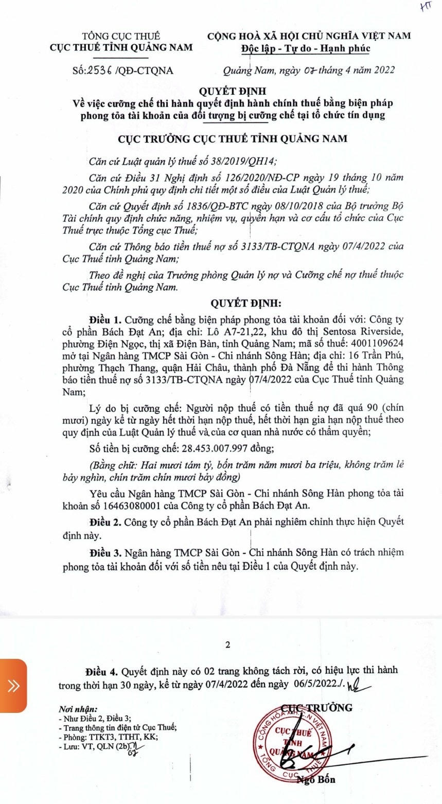 Trước đó, ngày 7/4/2022, Cục Thuế tỉnh Quảng Nam đã có quyết định số 2536/QĐ-CTQNA về việc cưỡng chế thi hành quyết định hành chính thuế bằng biện pháp phong tỏa tài khoản của đối tượng bị cưỡng chế tại tổ chức tín dụng.