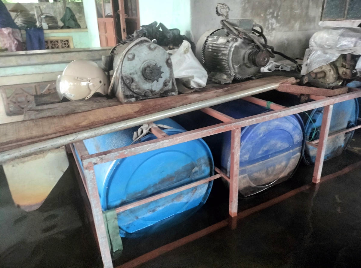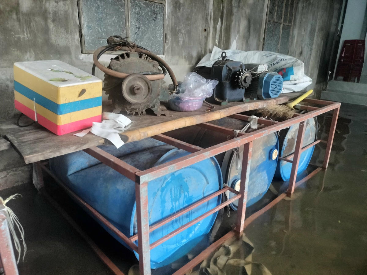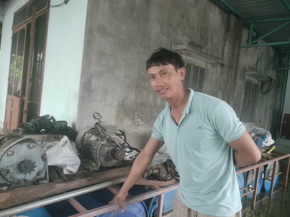 “Để làm được cái bè rộng khoảng 2 m, dài hơn 5 m, tôi phải mua 3 thùng nhựa lớn, giá tiền khoảng 400 ngàn đồng/thùng nhựa. Tiếp đến tôi làm thêm một khung sắt để giữ cố định các thùng nhựa lại. Sau đó tôi đưa máy móc, đồ đạc lên chiếc bè. Chiếc bè có thể chứa khoảng 1 tấn hàng. Khi nước lũ dâng cao, chiếc bè tự động nổi lên. Còn khi nước lũ rút xuống thì chiếc bè tự động hạ xuống”, ông Châu Văn Cư nói.