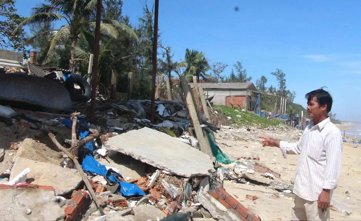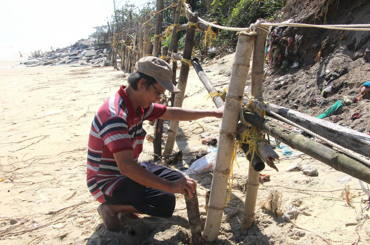 Khi chúng tôi có mặt ở đây, ông Ngô Văn Truyền, trú thôn Hà Lộc đang đóng cọc tre dọc bờ biển cho hay, cơn bão số 5 gây nên triều cường quá mạnh đánh vào bờ gây sạt lở một khu đất vườn của gia đình ông có chiều dài khoảng 30m, sâu vào bờ vài mét bị đổ sập xuống biển. Lo sợ đất vườn bị sạt lở trôi hết ra biển nên ông cùng người dân đã đi mua các cây tre đem về cắt đoạn đóng xuống dọc bờ biển tạo thành bờ kè. Sau đó dùng cát đổ vào chỗ bị sạt lở nhằm giữ đất vào mùa biển động mạnh. Nhưng theo ông, đây chỉ là biện pháp tạm thời, còn về lâu dài cần xây dựng kè cứng mới đảm bảo chống sạt lở.