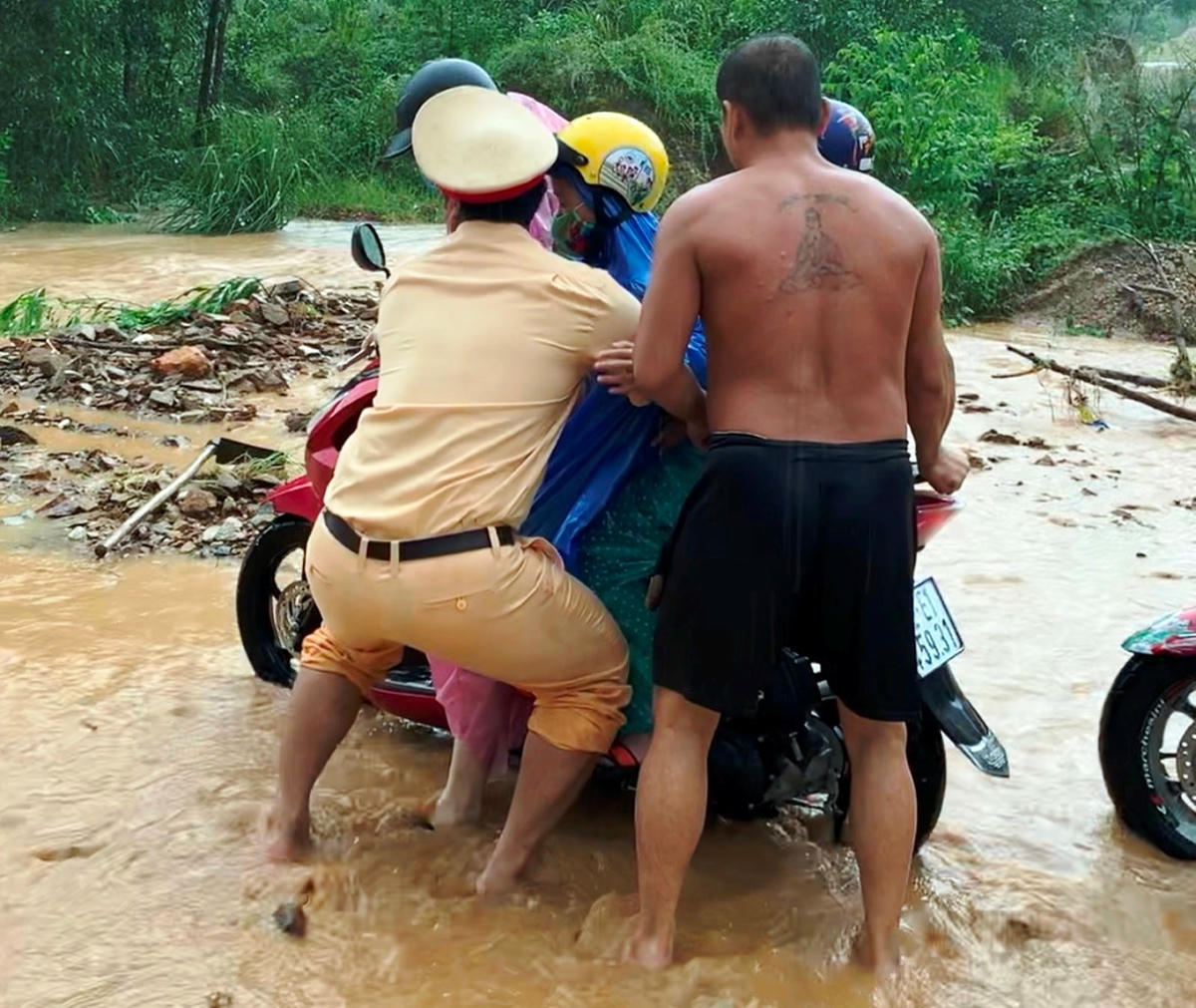 Nước lên rất nhanh trong đêm khiến người dân khẩn trương dọn dẹp đồ đạc tránh lũ. Trong khi đó, tuyến QL14B đoạn qua địa bàn các huyện Đại Lộc, Nam Giang có đoạn ngập sâu do nước từ khe suối chảy tràn qua. Lực lượng CSGT đường bộ - đường sắt đã có mặt để hỗ trợ, giúp đỡ người dân tại những điểm này.