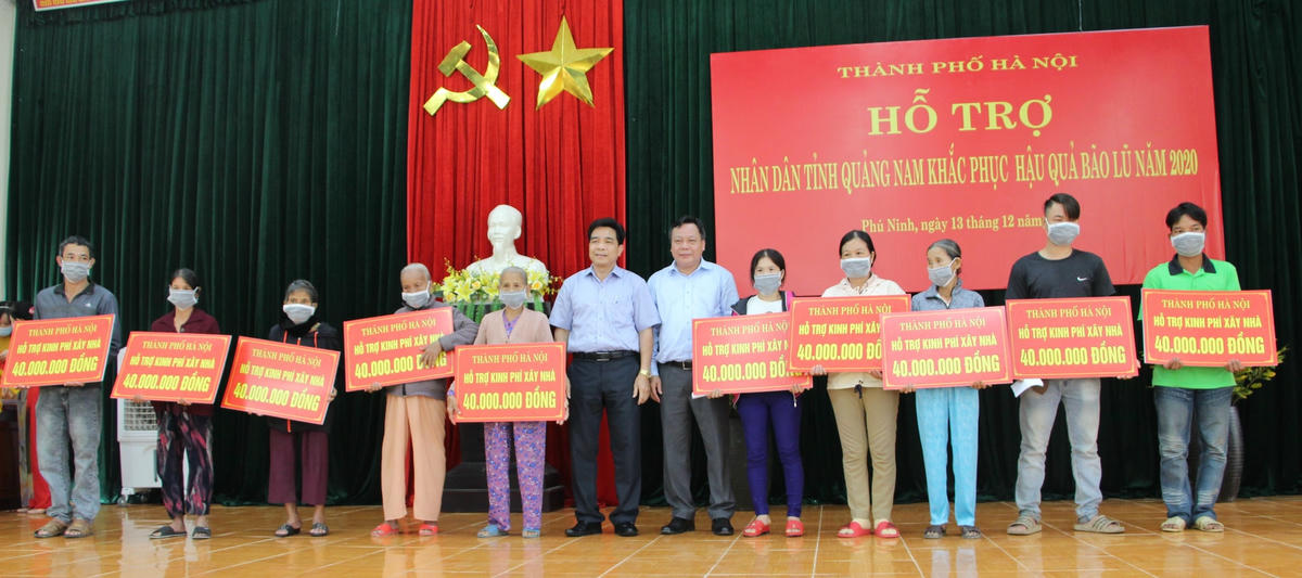 Dịp này, Đoàn công tác TP Hà Nội đã về thăm người dân huyện Phú Ninh và hỗ trợ kinh phí cho 40 hộ gia đình. Trong đó, 10 nhà sập hoàn toàn, mỗi nhà 40 triệu đồng; 10 nhà hư hỏng cần sửa chữa, mỗi nhà 20 triệu đồng; 20 gia đình cần hỗ trợ phương tiện sản xuất, mỗi hộ 15 triệu đồng, với tổng kinh phí 900 triệu đồng.