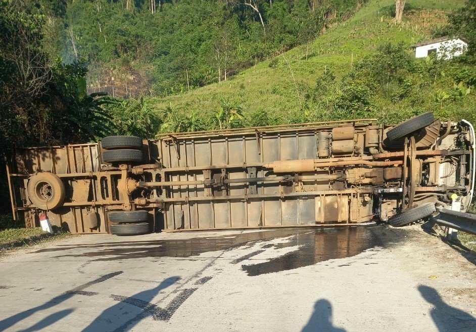 Xe tải đang lưu thông trên đường Hồ Chí Minh, qua địa phận huyện Phước Sơn, tỉnh Quảng Nam bất ngờ lật nghiêng chắn ngang giữa đường, khiến một người tử vong.