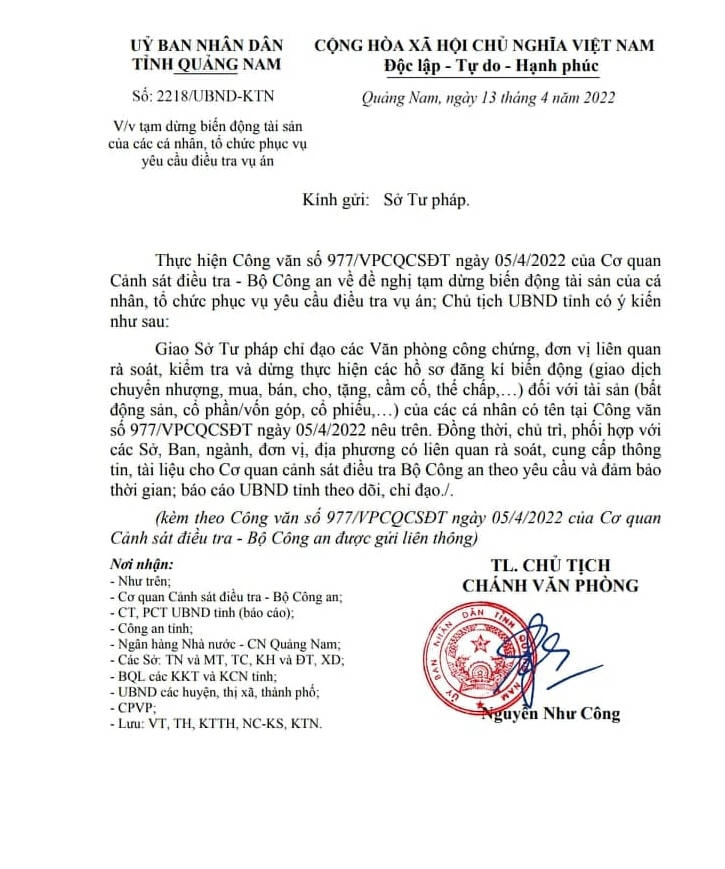 Ngay sau khi tiếp nhận công văn của Bộ Công an, ngày 13/4, Chủ tịch UBND tỉnh Quảng Nam Lê Trí Thanh giao Sở Tư pháp chỉ đạo các Văn phòng công chứng, đơn vị liên quan rà soát, kiểm tra và dừng thực hiện các hồ sơ đăng kí biến động (giao dịch chuyển nhượng, mua, bán, cho, tặng, cầm cố, thế chấp,…) đối với tài sản (bất động sản, cổ phần/vốn góp, cổ phiếu,…) của các cá nhân có tên tại Công văn số 977/VPCQCSĐT nêu trên.
